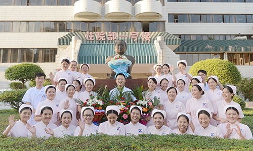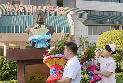 学子们前来拜谒我院创始人平乐郭氏正骨第五代传人高云峰铜像,手拿洁白的毛巾为奶奶“梳妆”,并给奶奶敬献了花篮。