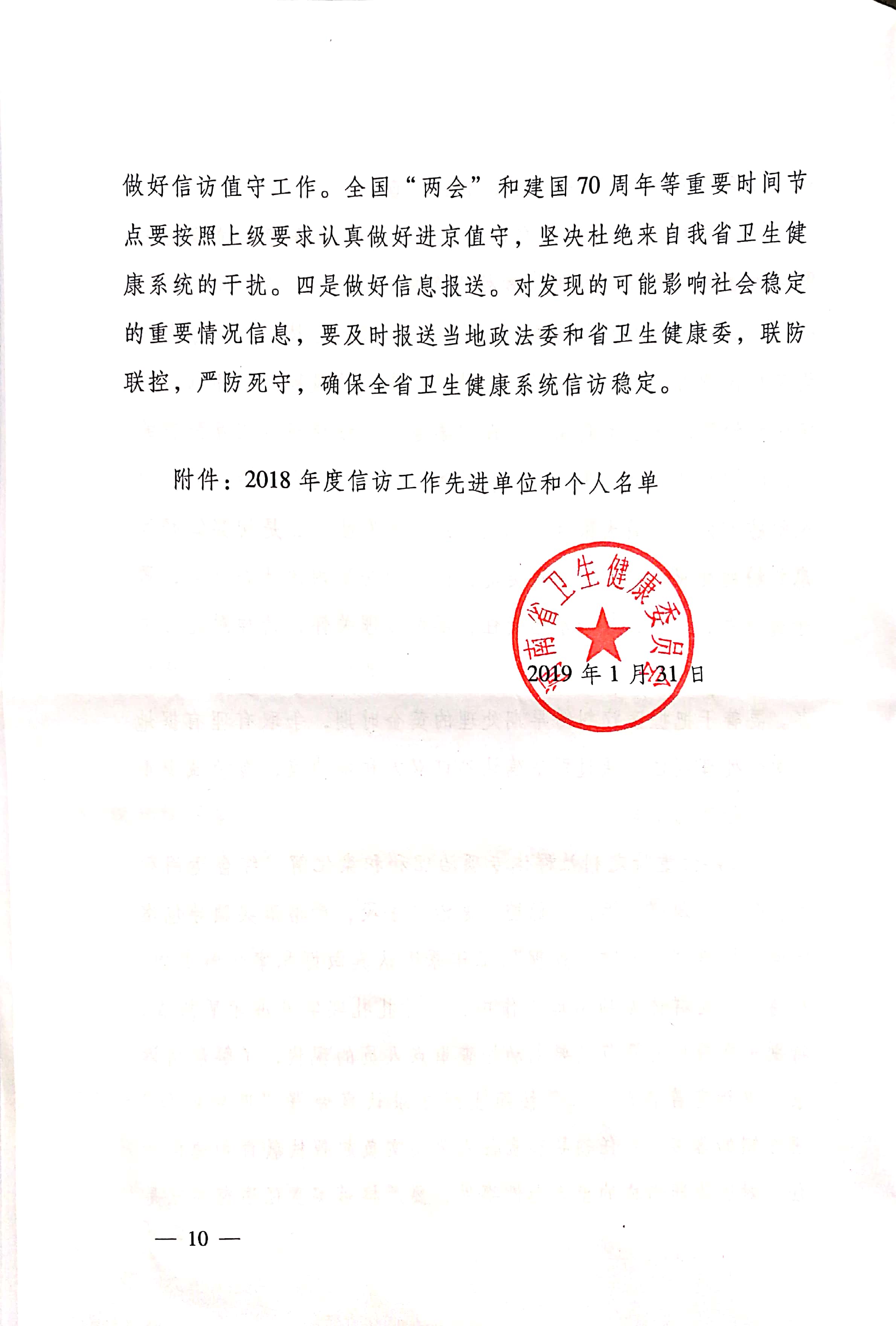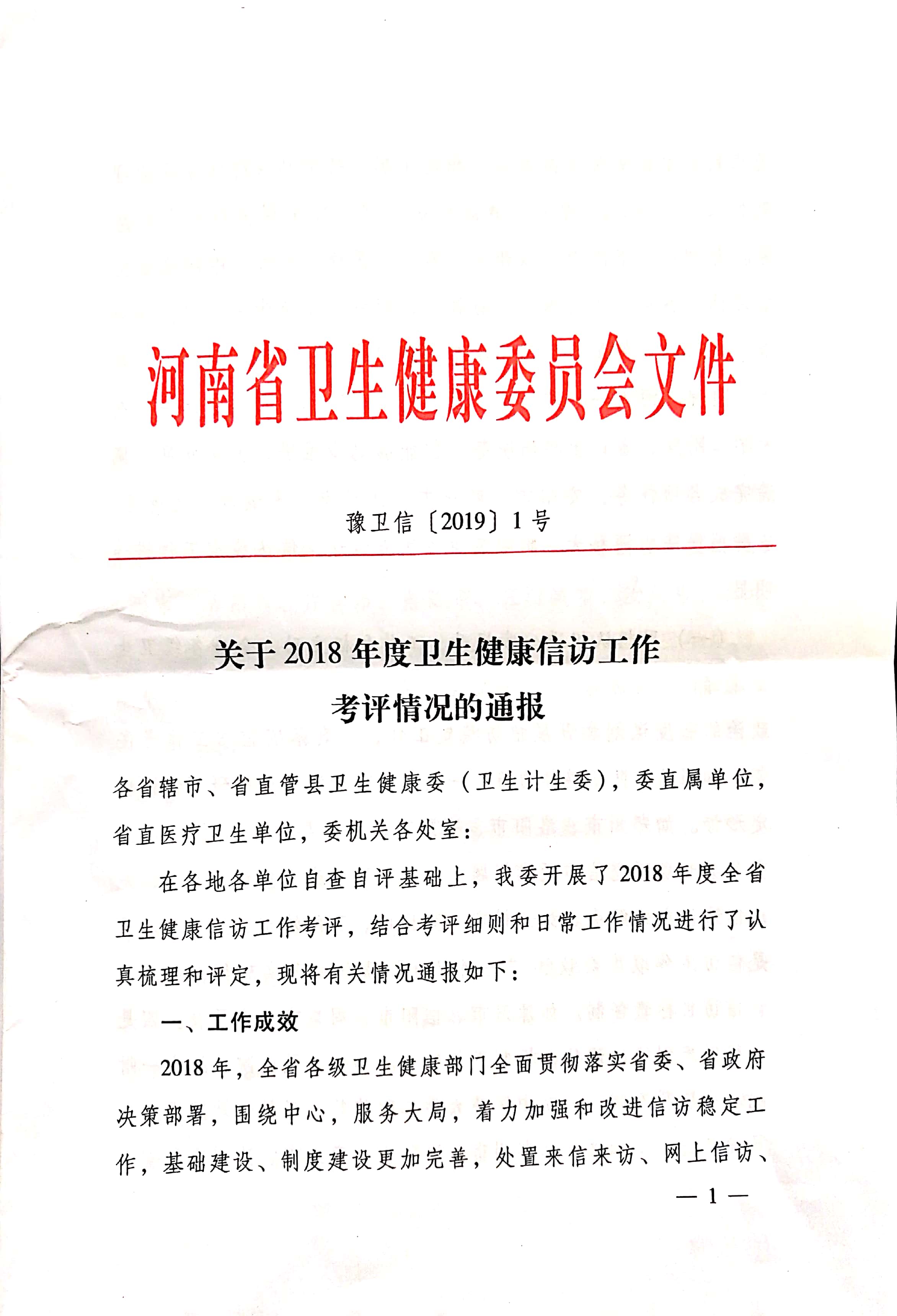 为着力加强和改进信访稳定工作,近日,河南省卫生健康委员会开展了2018年度全省卫生健康信访工作考评,我院被评为“2018年度信访工作先进单位”。