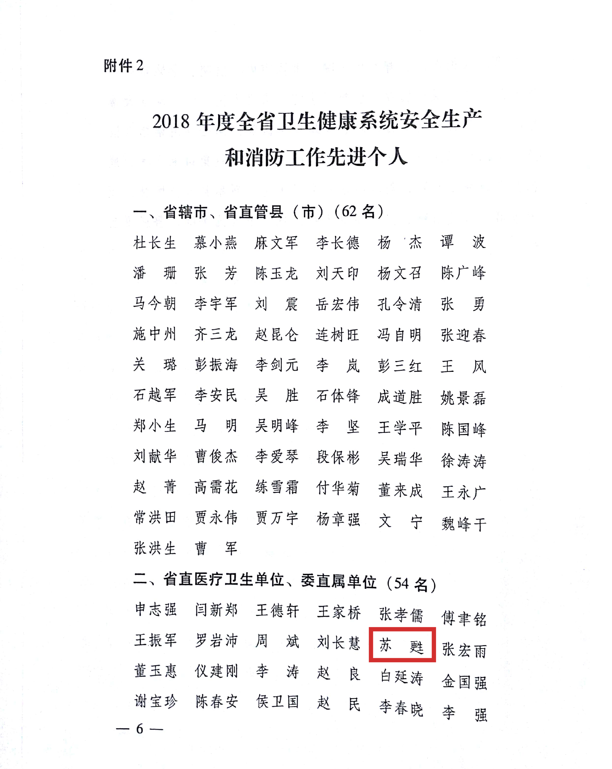 2018年,我院以党的十九大精神为指导,全面贯彻落实习近平总书记关于安全生产工作重要论述,牢固树立安全发展理念,安全生产和消防工作年度目标顺利实现。根据年度两次安全生产和消防工作大检查及年终考核情况,结合河南省消防安全委员会情况反馈,经综合评定,我院被河南省卫生健康委评为“2018年度卫生健康系统安全生产和消防工作先进单位”,我院苏甦、仲斌被评为“2018年度卫生健康系统安全生产和消防工作先进个人”。