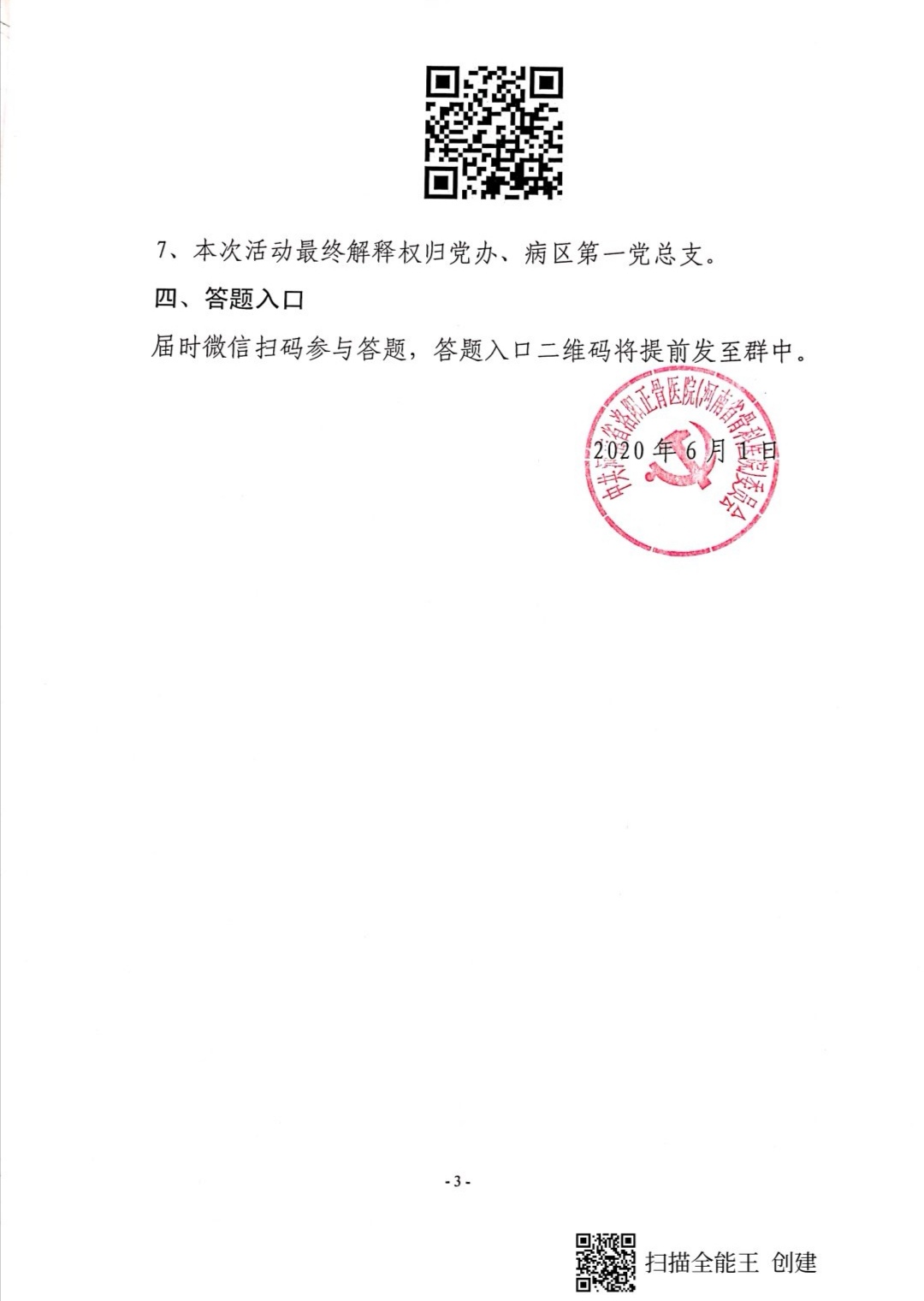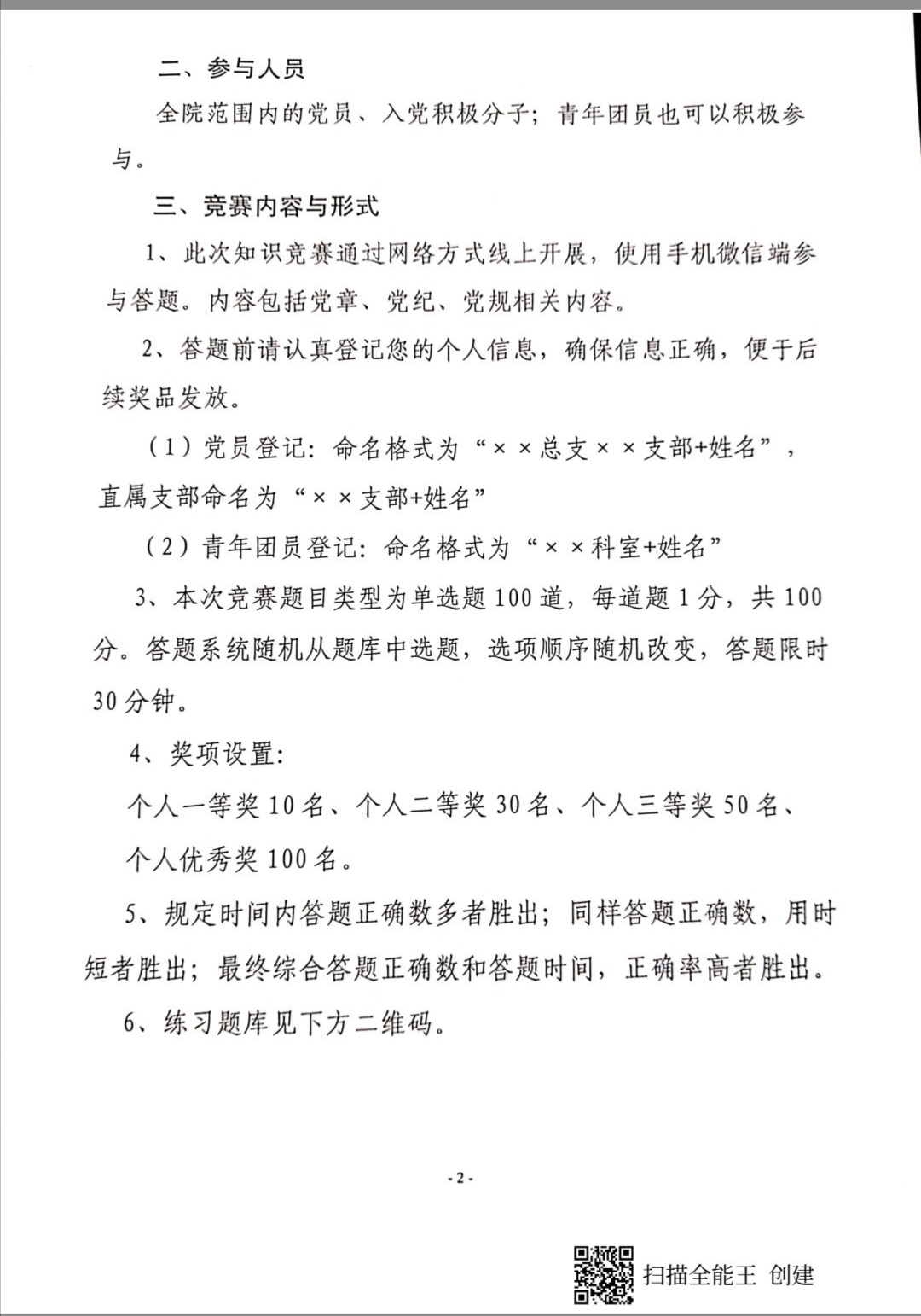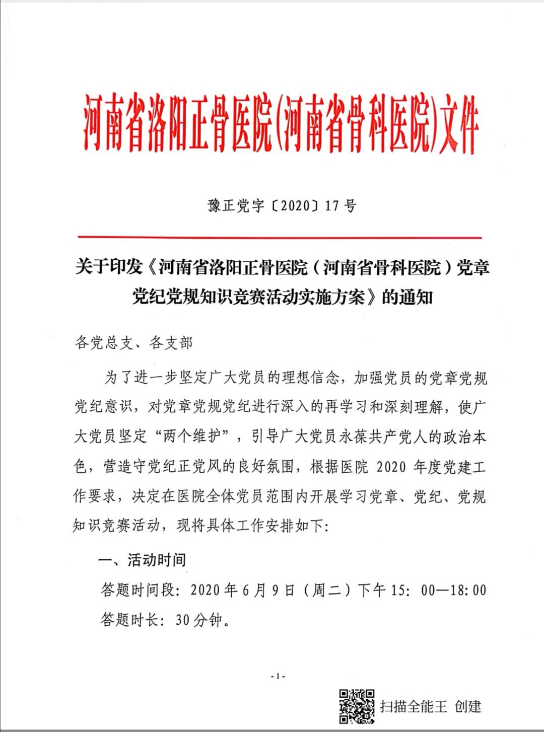 这次知识竞赛由党办牵头、病区第一党总支承办。由于疫情的原因,无法将全体党员、入党积极分子及青年团员召集在一起开展竞赛,为此,病区第一党总支专门召开总支扩大会议,讨论竞赛形式及相关后续工作。大家出主意、想办法,最后决定以手机微信问卷星的形式,在固定的时间、在全院范围内开展竞赛活动。