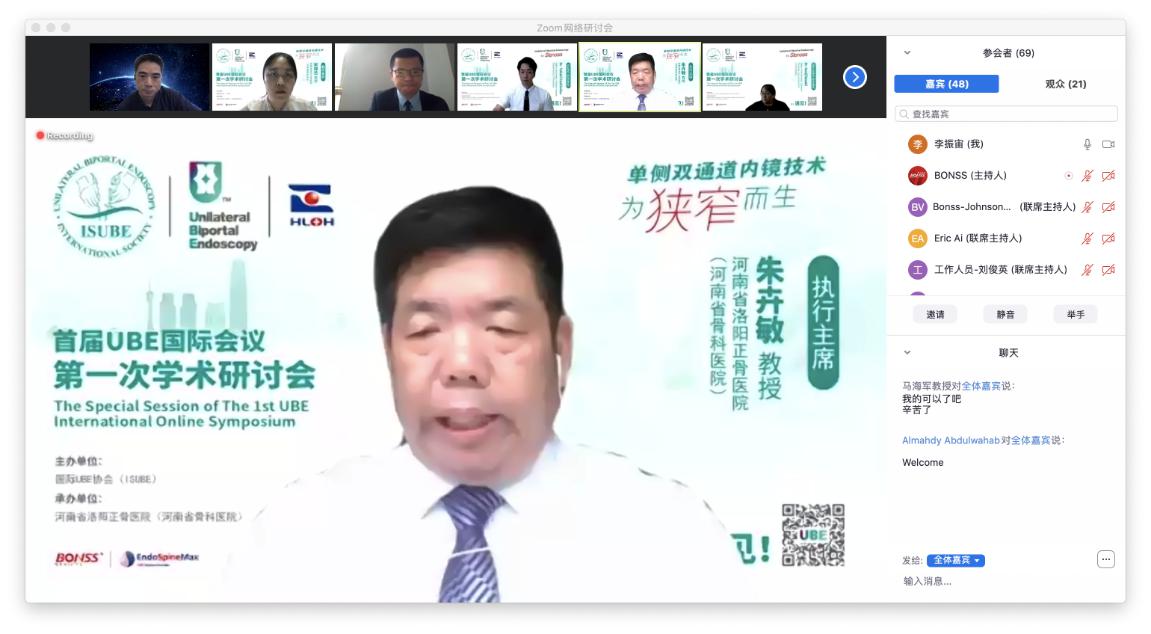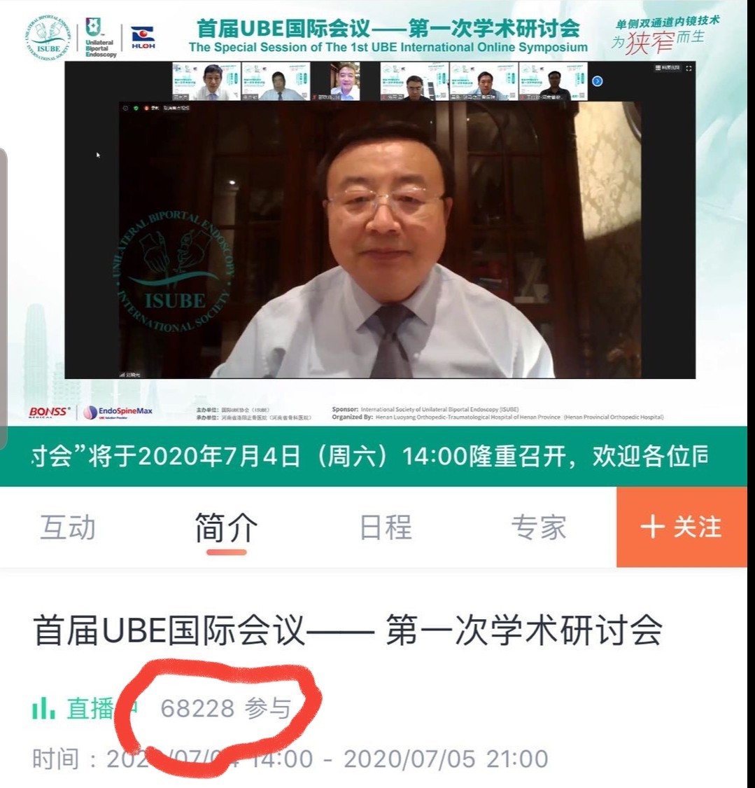 2020年7月4日,必将被中国脊柱微创界和世界部分国家的微创专家所铭记,因为广受关注的“世界UBE国际会议第一届学术研究会”在当天圆满召开。本次会议的举办,受到中国、韩国、日本、乌克兰、埃及、印度等十几个国家近四十位专家的广泛关注,各位专家参与手术演示、学术讲座、会议交流。受当前全球新型冠状病毒疫情的影响,本次会议采取线上线下结合,互联网全球直播的形式进行,会议规模大、影响力广,网络观看人次接近七万。本次会议由国际UBE协会主办,河南省洛阳正骨医院(河南省骨科医院)承办。