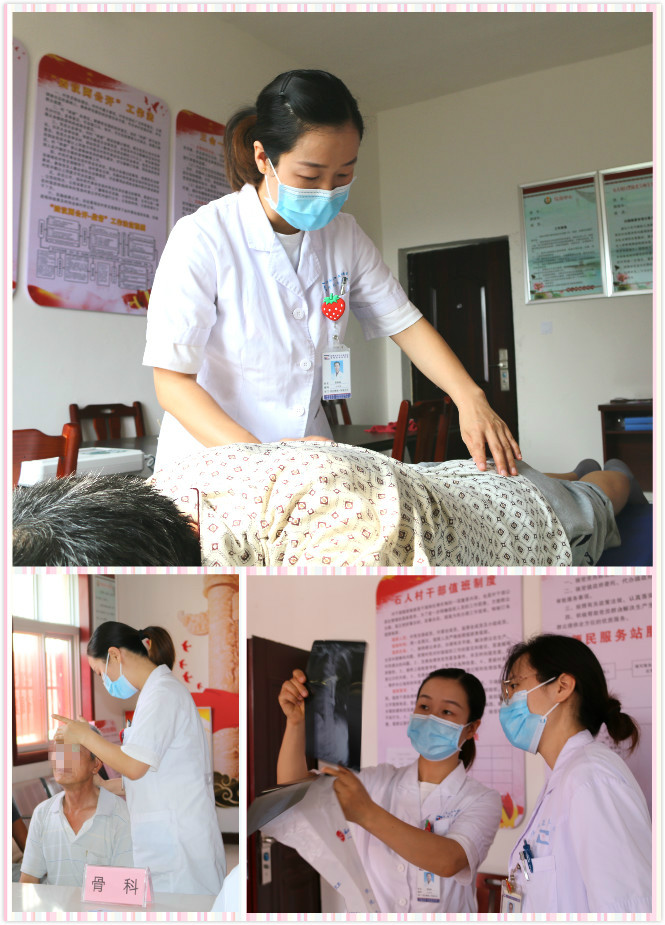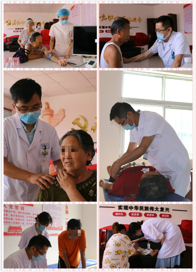 李亚楠医生细心地为乡亲们查体,并贴膏药为他们缓解疼痛。郝权医生为乡亲们进行心电图测量和听诊,根据病情的轻重缓急给出相应的医疗建议。薛原医生为孩子们进行身体检查,护士宗艳瑞为大家测量血压。