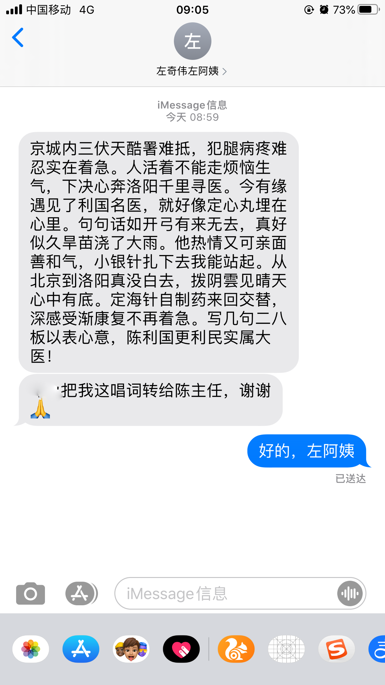 京城内三伏天酷暑难抵,犯腿病疼难忍实在着急。人活着不能走烦恼生气,下决心奔洛阳千里寻医。今有缘遇见了利国名医,就好像定心丸埋在心里。句句话如开弓有来无去,真好似久旱苗浇了大雨。他热情又可亲面善和气,小银针扎下去我能站起。从北京到洛阳真没白去,拨阴雲见晴天心中有底。定海针自制药来回交替,深感受渐康复不再着急。写几句二八板以表心意,陈利国更利民实属大医!