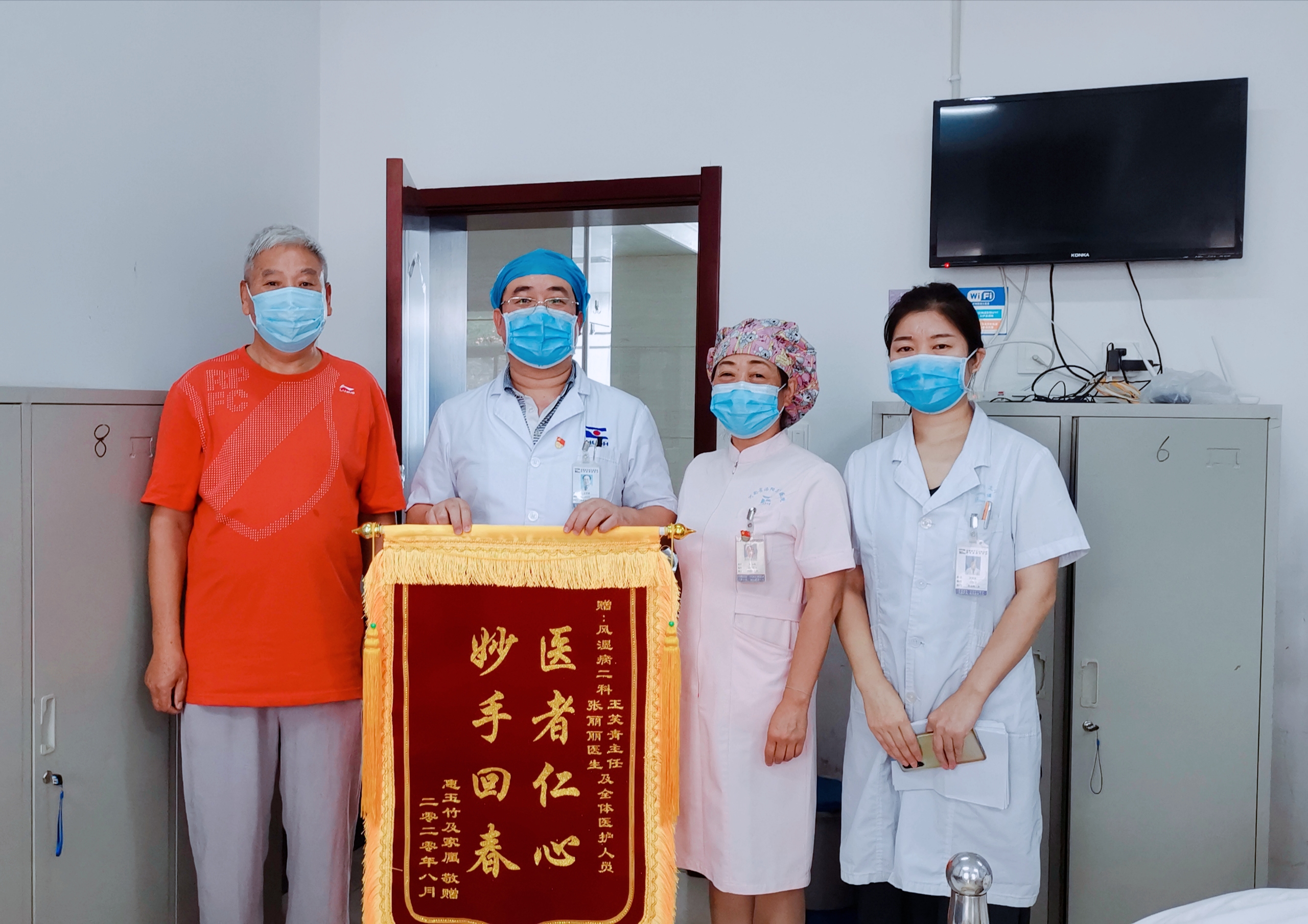 8月18日上午9时,风湿病二科王笑青主任按照惯例正带领全科医生进行科室医疗大查房,刚步入2号病房,9病床病人惠某的爱人手捧一面锦旗迎了上来,拦着王主任说:“把一幅锦旗送给您,我代表老伴感谢你们高超的医术,真是妙手回春!她又可以下地走路了,我们非常高兴!谢谢您和您带领的优秀团队。另外我知道明天就是医师节,也通过这面旗子向您和广大医护人员表达崇高的敬意,算是给你们的礼物吧。”