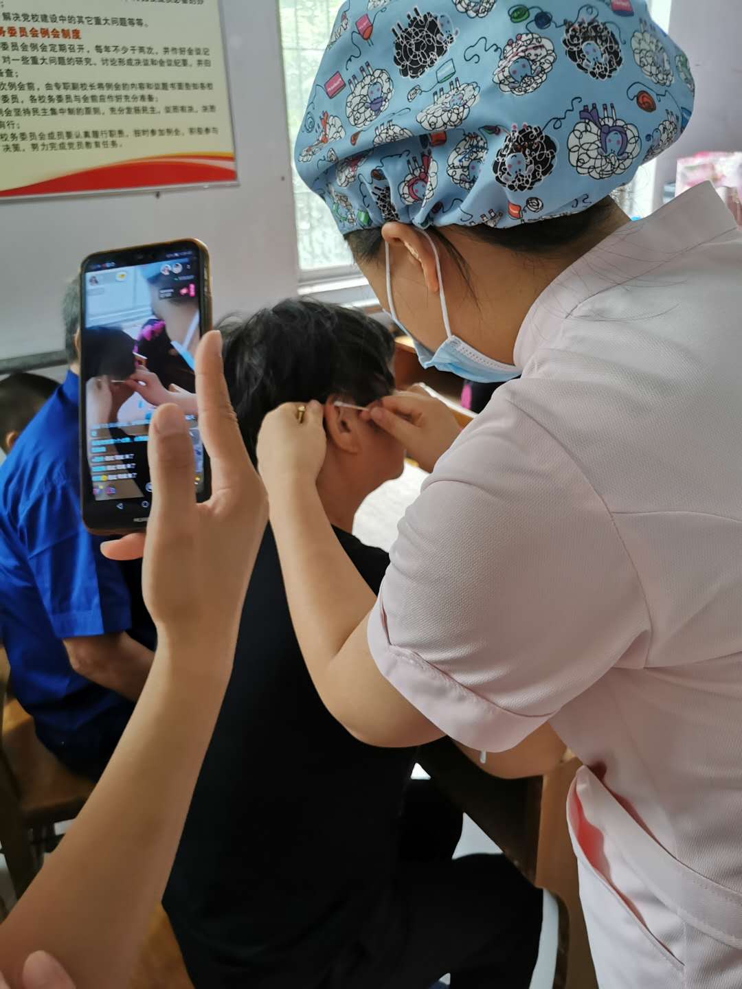 护理部王丹丹和3名护理研究生,为社区群众量血压、测血糖、帖耳穴。并在保护患者隐私的前提下,利用网络手段直播贴耳穴,向更多的患者解释普及中医学文化和治疗手法。