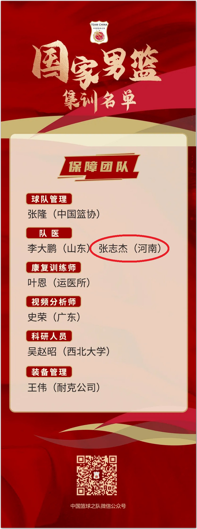2020年9月1日到9月20日,中国男篮将进行短期集训。河南省洛阳正骨医院康复院区管委会副主任张志杰博士入选新一届中国男子篮球队担任队医,为中国男篮提供专业的伤病预防和康复医疗保障服务。
