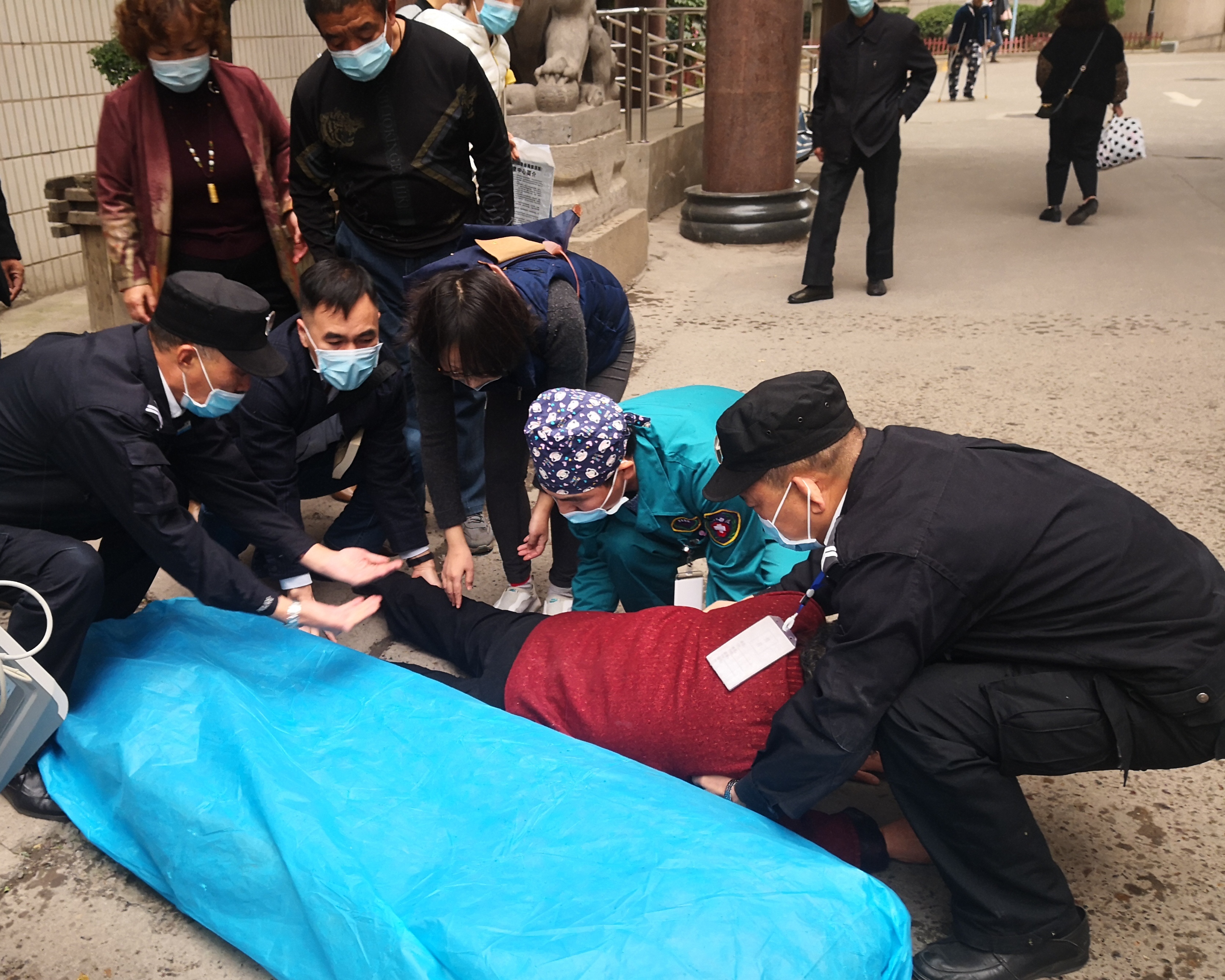 10月27日中午,一名60多岁女性患者在我院东花坛院区CT检查室门口突然跌倒,不能动弹,呻吟不止。龙祥物业保安队队员白正涛、张为民快速拨打院内急救电话,膝部损伤三科主诊组长张江涛正好下班路过,马上蹲下来查看患者的情况。