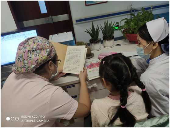 在陈利国主任、文永兵医师的精心诊治与护士们耐心开导下,小姑娘慢慢变得活泼起来,能和护士站的马源玩成一片。马源也会在每天繁忙的工作中,抽出时间辅导小姑娘学习、写作文。