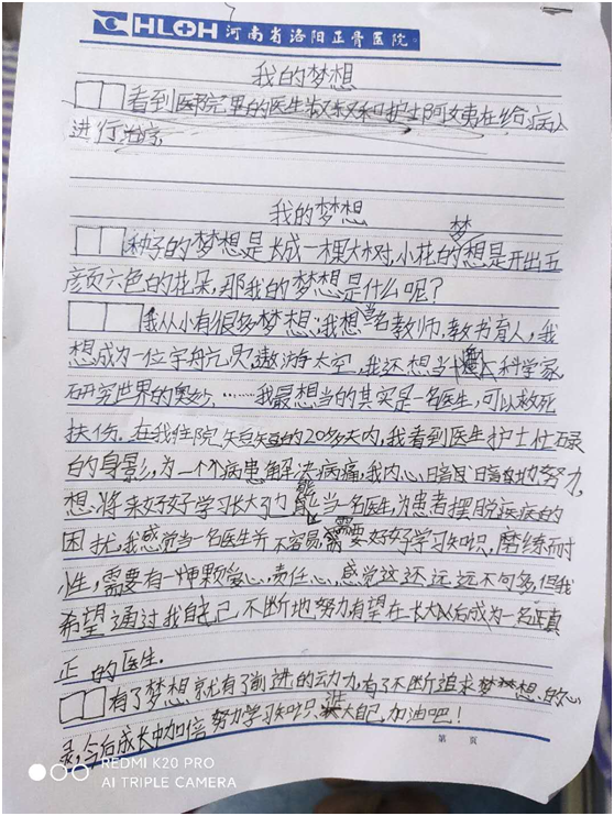 一天,大家和小姑娘谈论起梦想,小姑娘不假思索地说:“看到洛阳正骨的神奇医术,我长大了也要做一个骨科医生,来正骨医院上班,和这里的叔叔阿姨一起,给像我一样的需要关心照顾的小朋友看病。”简单质朴的话,却让大家的心里满是感动。当即,小姑娘写下了这篇题为《我的梦想》的文章。