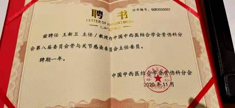 2020年11月11日—13日,第27届中国中西医结合骨伤科学术年会在广东佛山召开,12日下午,中国中西医结合学会骨伤分会骨与关节感染专业工作委员会正式成立,我院骨髓炎疾病诊疗中心主任王新卫教授当选主任委员。