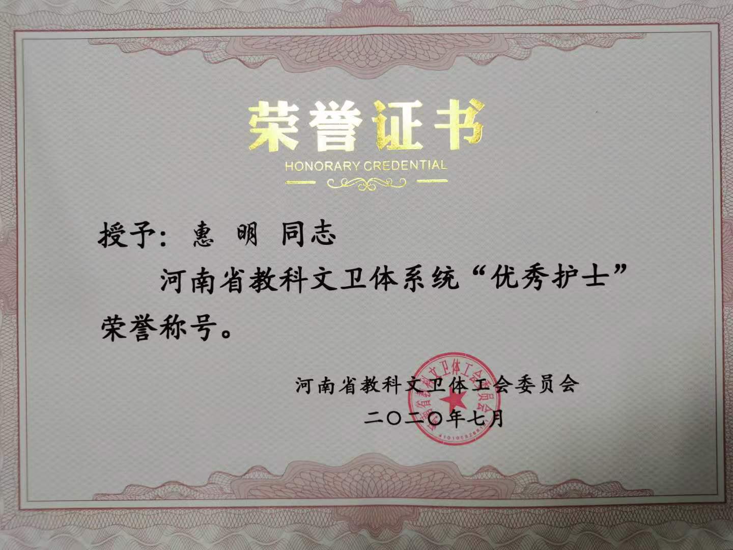 近日,河南省教科文卫体工会委员会传来喜讯,我院洛阳院区急诊科护师惠明同志,获得河南省科教文卫体系统“优秀护士”荣誉称号。