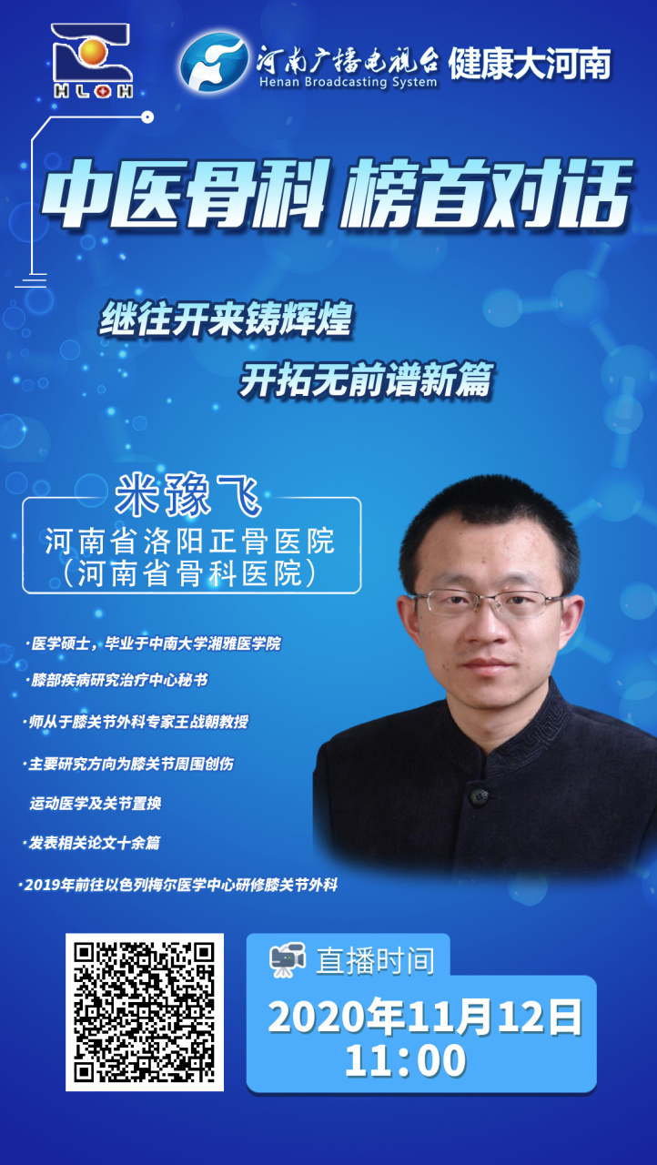 在新近发布的2020年度《中国中医院综合实力排行榜》中,我院位居年度中国中医院综合实力排行榜骨科榜首。河南广播电视台《健康大河南》栏目在榜单发布的第一时间,特别推出【中医骨科?榜首对话】系列节目。11月12日,我院膝部疾病研究治疗中心主任王战朝、中心秘书米豫飞受邀参加专访。