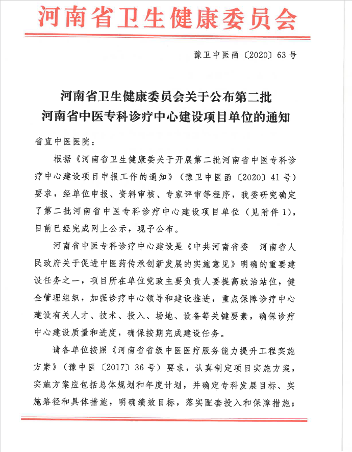 近日,河南省卫生健康委员会发布了《河南省卫生健康委员会关于公布第二批河南省中医专科诊疗中心建设项目单位的通知》(豫卫中医函〔2020〕63号),我院骨病、颈肩腰腿痛、运动医学专科正式确定为第二批河南省中医专科诊疗中心建设项目。