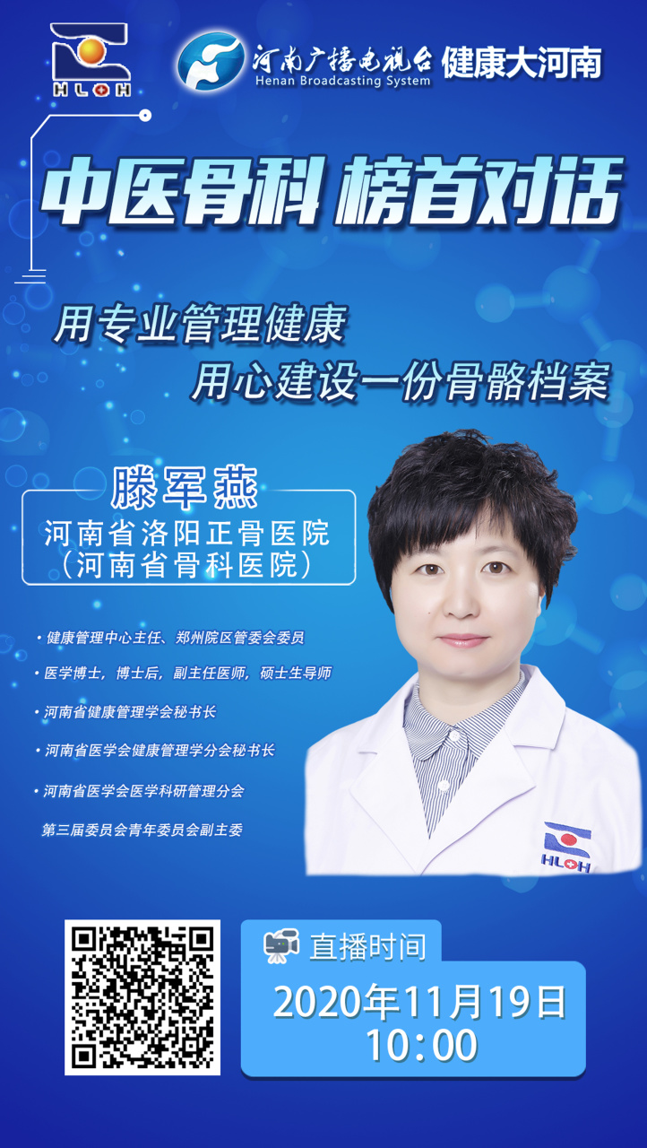 在新近发布的2020年度《中国中医院综合实力排行榜》中,我院位居年度中国中医院综合实力排行榜骨科榜首。河南广播电视台《健康大河南》栏目在榜单发布的第一时间,特别推出【中医骨科?榜首对话】系列节目。11月19日,我院健康管理中心主任、郑州院区管委会委员腾军燕受邀参加专访。