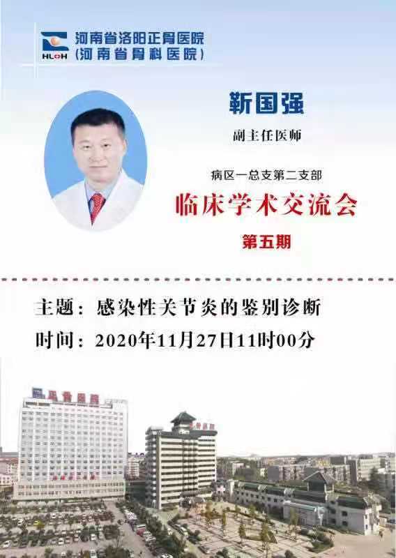 病区第一总支第二支部在工作之余,为更好提升医护人员专业水平,继续坚持努力践行“健康中国战略”、“学习先进典型,争当先锋模范”的主旨思想,再次开展别开生面的支部内主题生活会。11月27日上午11时,支部所属骨髓炎一科副主任医师靳国强在支部钉钉群直播本支部第五期学术主题讲座。