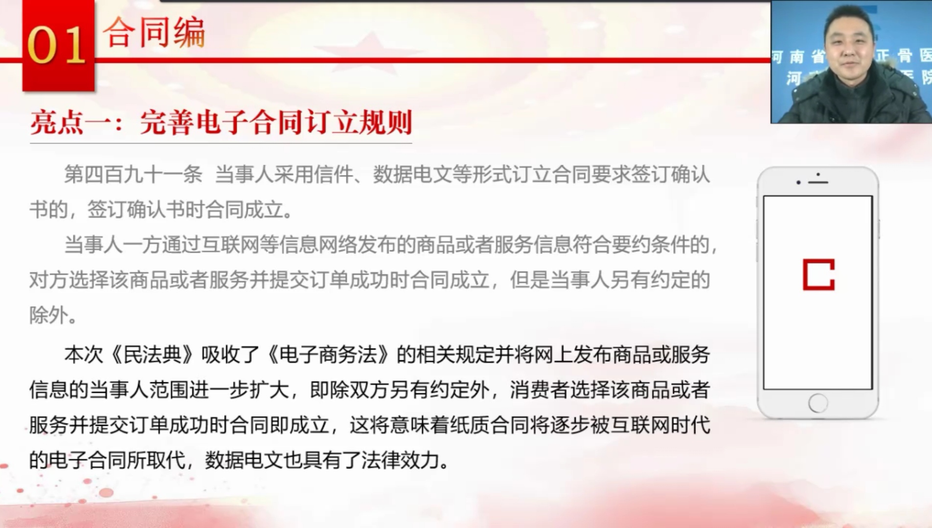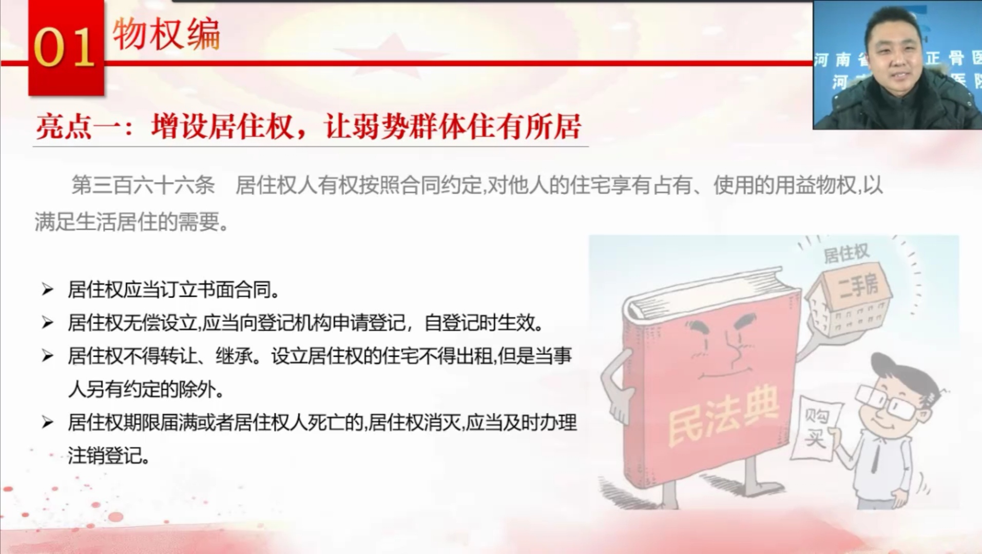 2020年12月4日是第七个国家宪法日,为增强全院工作人员的法律知识,12月2日下午3:30,“正骨讲堂”第109期特邀请北京观韬中茂(郑州)律师事务所律师李元鹏为全院职工进行即将实施的《中华人民共和国民法典》常用知识培训。