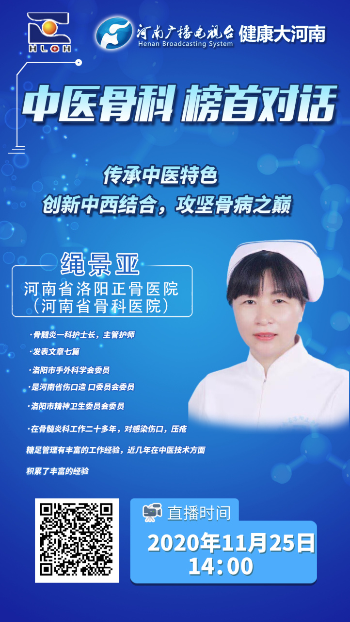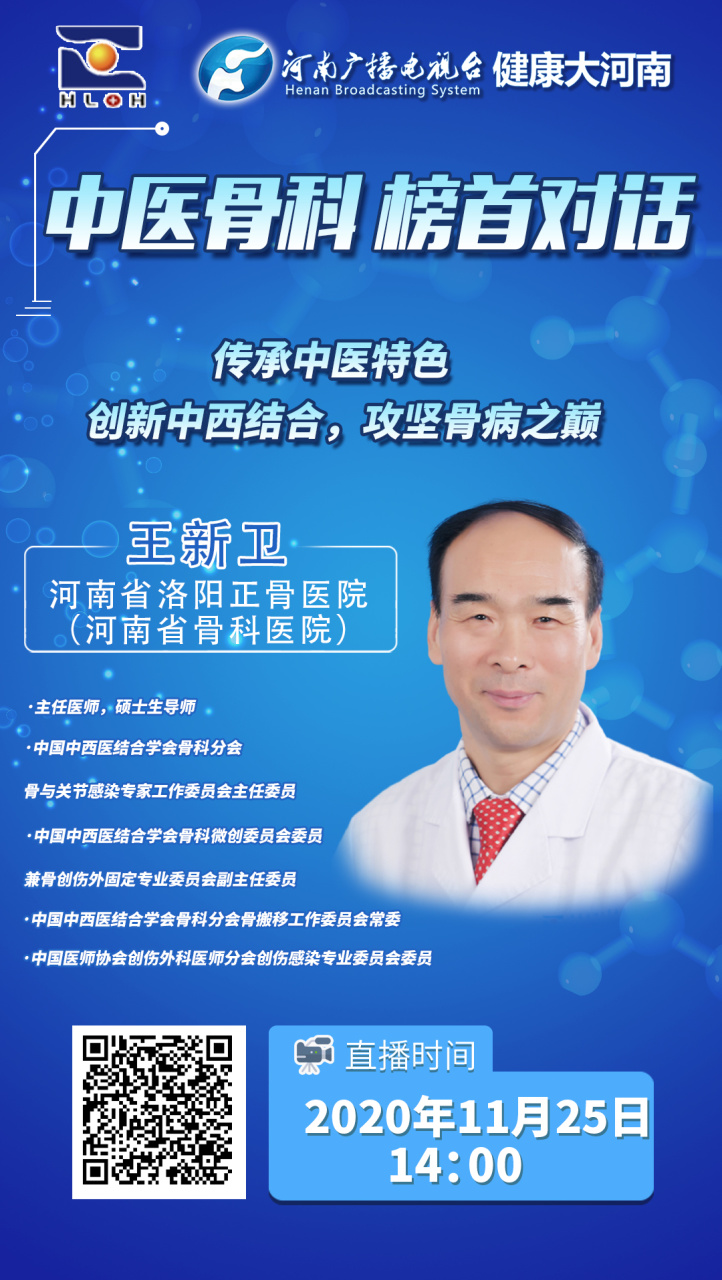 在新近发布的2020年度《中国中医院综合实力排行榜》中,我院位居年度中国中医院综合实力排行榜骨科榜首。河南广播电视台《健康大河南》栏目在榜单发布的第一时间,特别推出【中医骨科?榜首对话】系列节目。11月25日,我院骨髓炎诊疗中心主任王新卫、主诊组长靳国强和护士长绳景亚受邀参加专访。