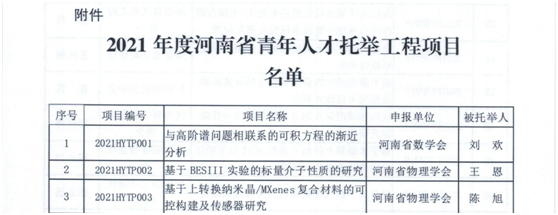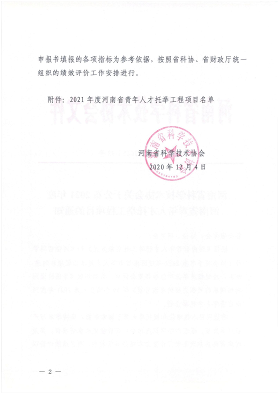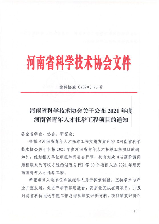 河南省青年人才托举工程项目是由河南省科学技术协会组织申报的一项省部级人才项目,该项目以习近平总书记系列重要讲话精神为指引,深入贯彻落实《河南省关于深化人才发展体制机制改革的意见》和《中共河南省委办公厅关于印发<河南省科协系统深化改革实施方案>的通知》精神,通过创新青年人才服务机制,助力青年科技工作者成长成才,推动青年科技人才的培养转型,为打造中西部科技创新高地,决胜全面小康社会、让中原更加出彩提供人才保障。该项目通过创新青年科技人才挖潜方式和培养模式,促进青年科技工作者成才成长,鼓励研究人员探索创新,坚持学术与产业并重发展,促进产学研深度融合,培养造就一支高水平青年科技人才队伍。