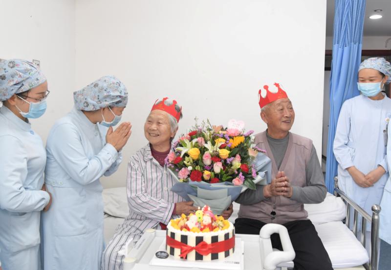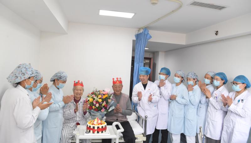 12月10日上午,在我院东花坛院区颈腰痛(推拿)三科的病房里,科室医护人员为住院患者屈阿姨以及陪护她的老伴杨先生共庆80寿诞,让两位老人一起过了一个不同寻常的生日。老人很是感动:“儿女不在身边,你们就像是我们的孩子!”