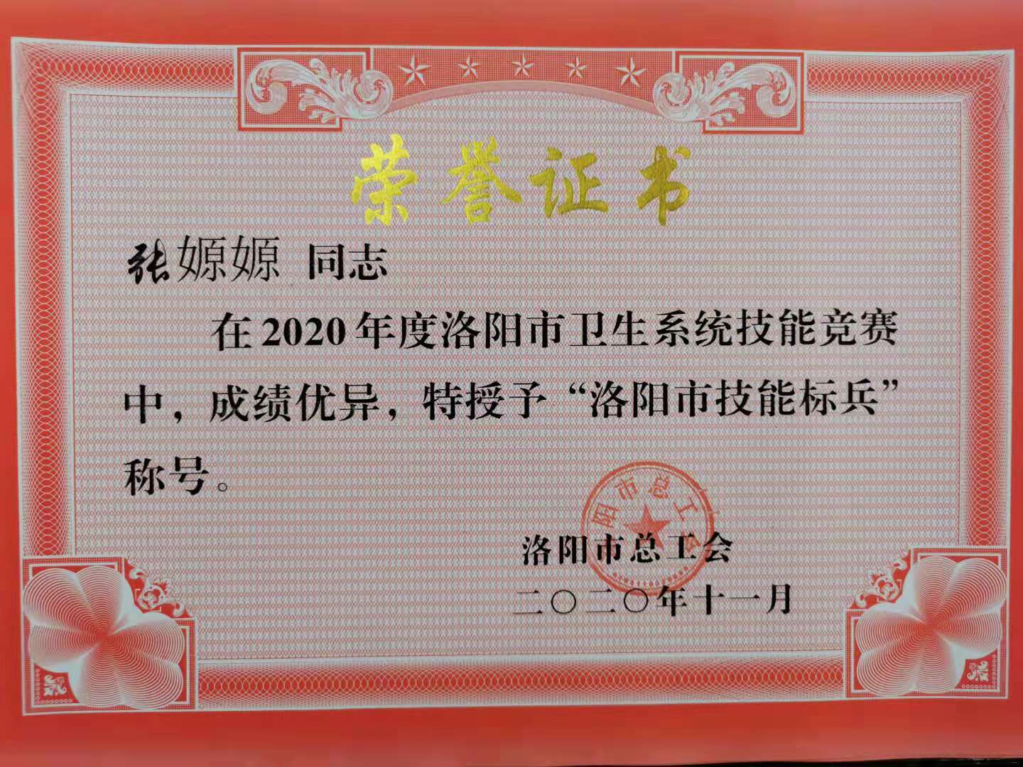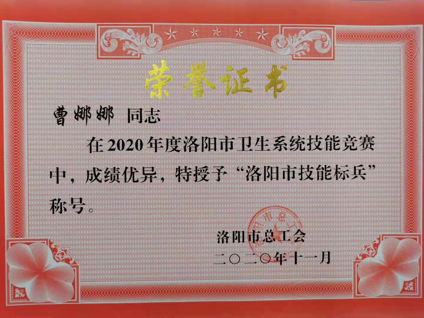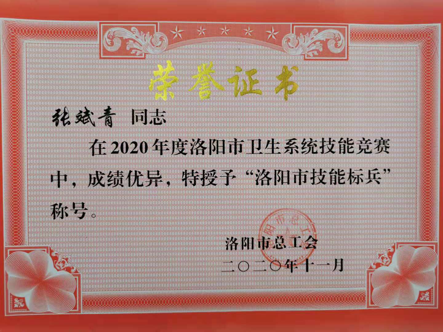 近日,洛阳市总工会传来喜讯,我院荣获洛阳市卫生系统“技能竞赛优秀组织单位”、8位同志(张斌青、裴卫国、曹娜娜、曹芮琦、王晓莹、杨静、张嫄嫄、赵俊桃)荣获“洛阳市技能标兵”荣誉称号。