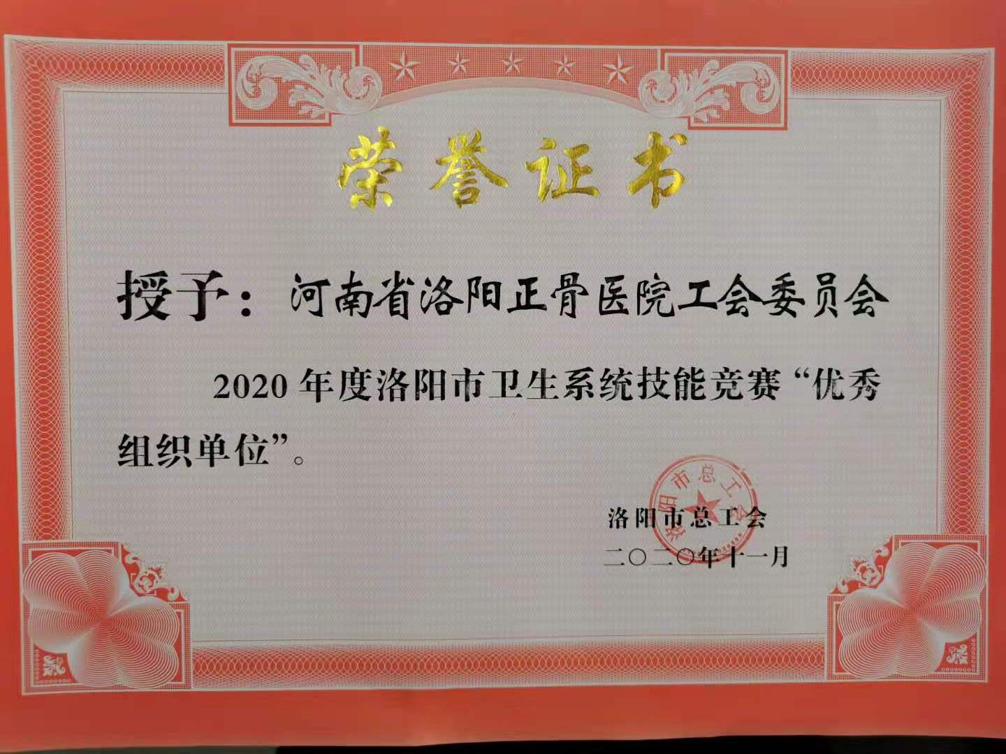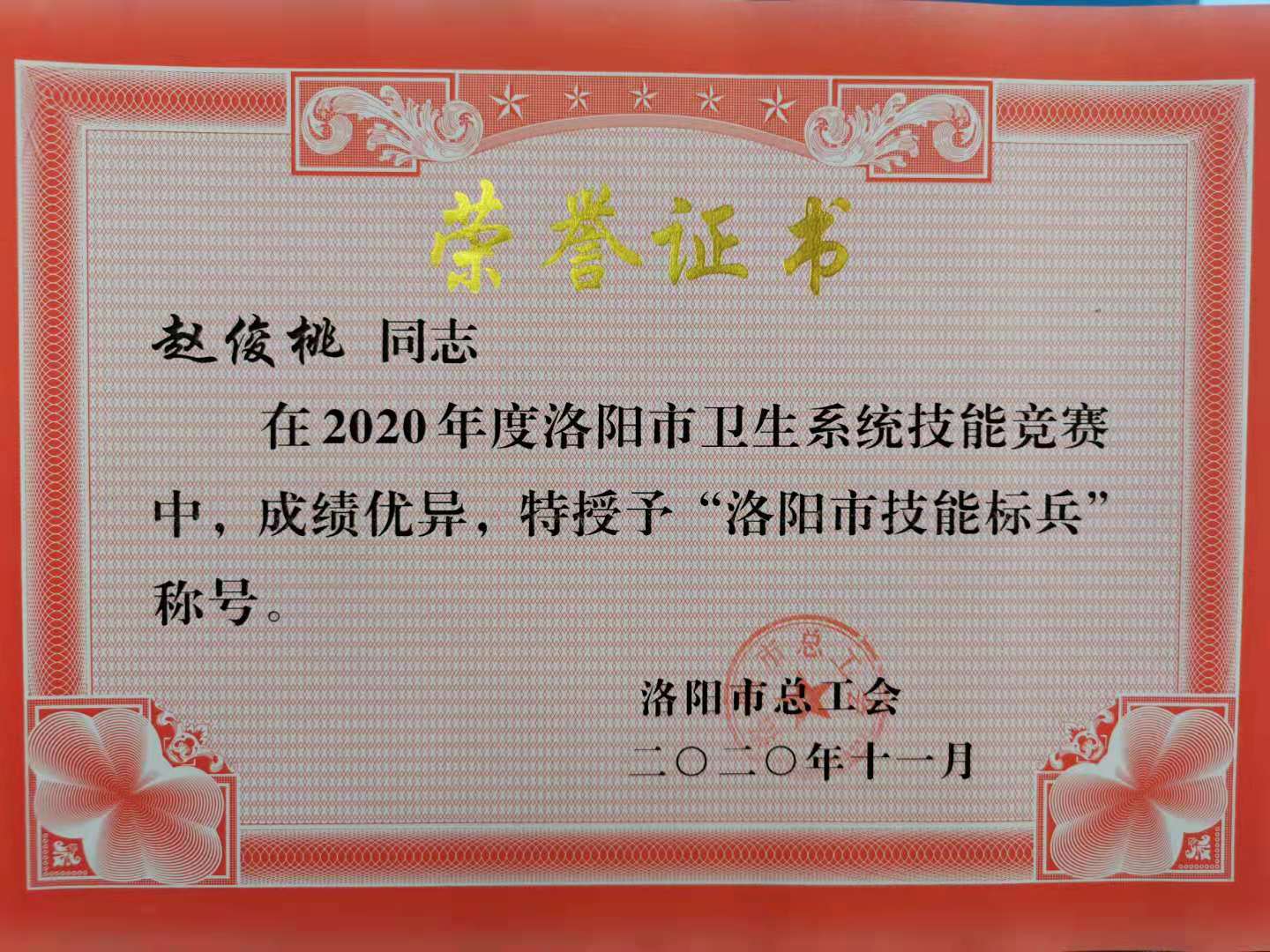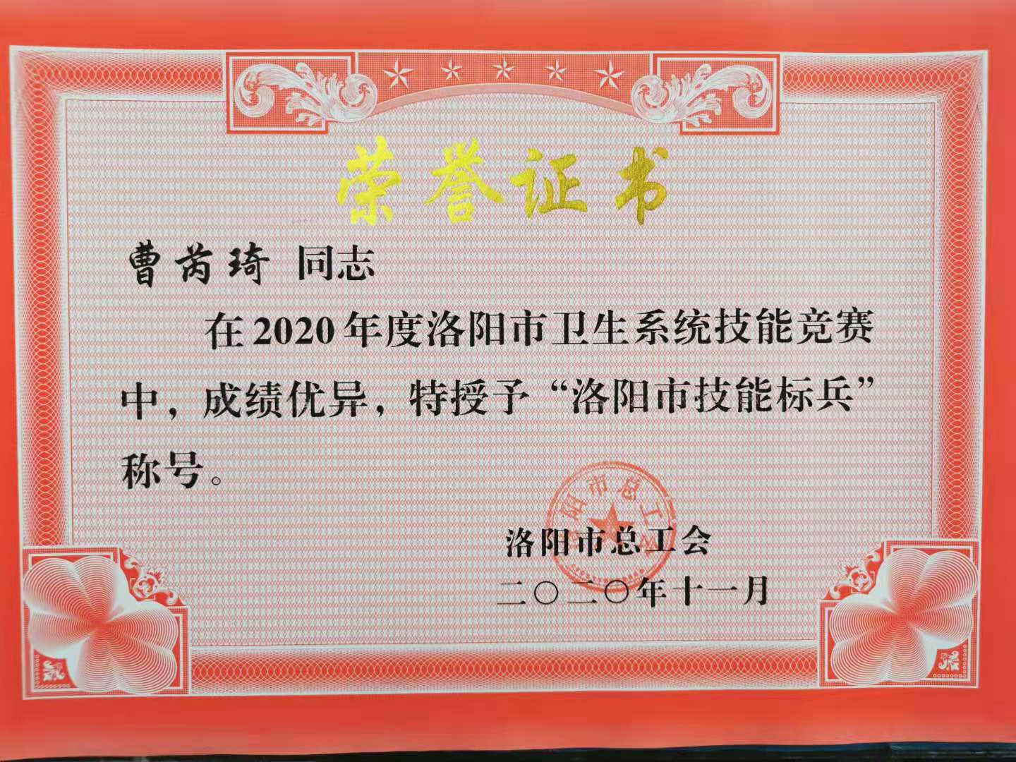 近日,洛阳市总工会传来喜讯,我院荣获洛阳市卫生系统“技能竞赛优秀组织单位”、8位同志(张斌青、裴卫国、曹娜娜、曹芮琦、王晓莹、杨静、张嫄嫄、赵俊桃)荣获“洛阳市技能标兵”荣誉称号。