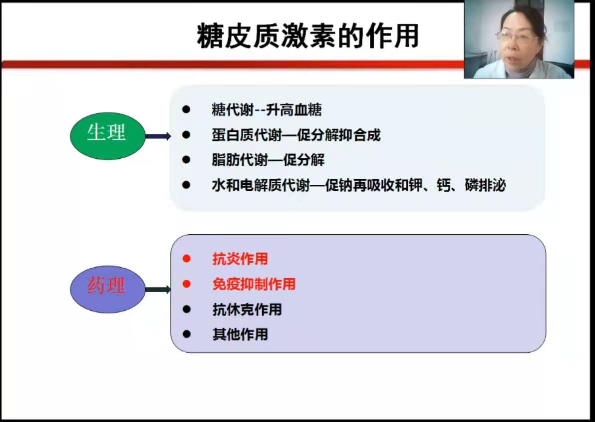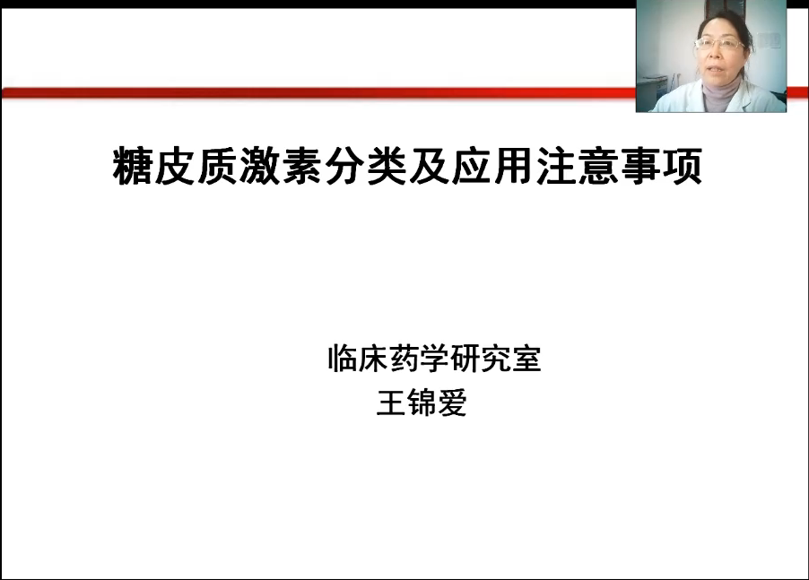 王锦爱副主任药师首先介绍了糖皮质激素的生理来源、分子结构、作用及药物适应症,随后又讲述了糖皮质激素的分类及作用特点,最后从特殊人群、用药疗程及撤药方案等方面对糖皮质激素应用中的注意事项进行了深入讲解,建议临床医师根据临床病例特征选择合适的药物品种及给药方案,加强药物安全性的监测,注意停药反应和反跳现象。