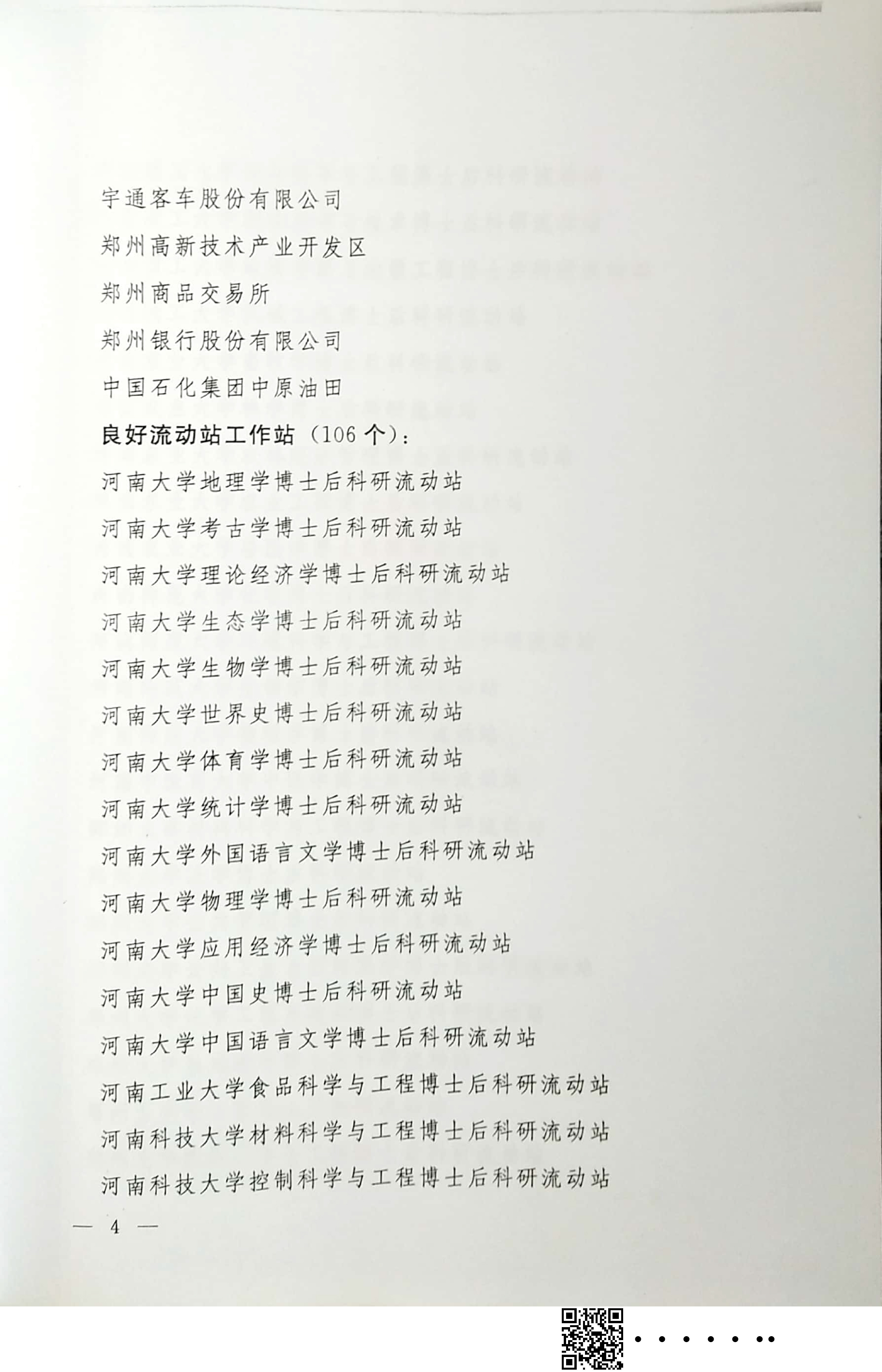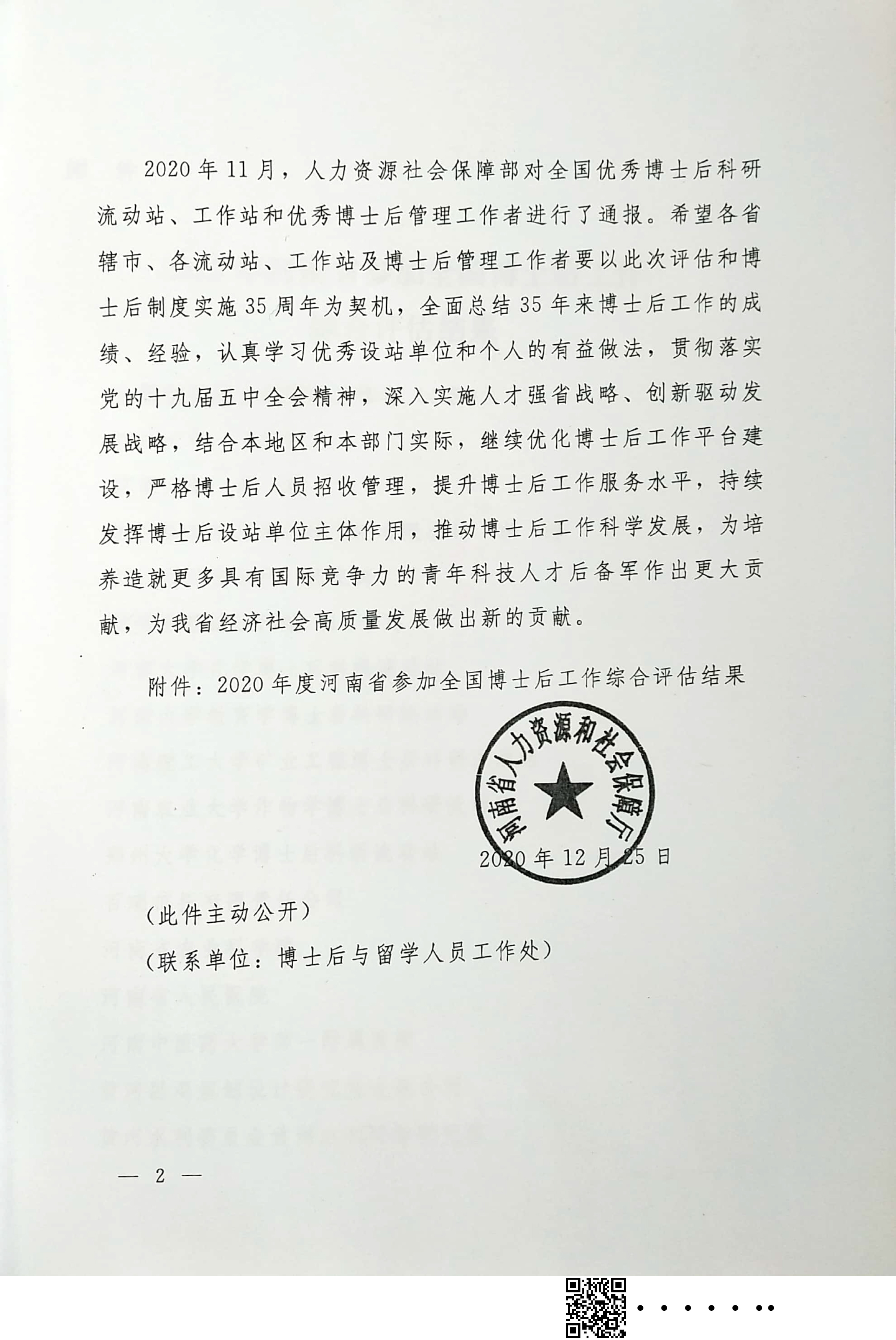 根据人力资源社会保障部、全国博士后管理委员会《关于开展2020年度博士后综合评估工作的通知》(人社部函〔2020〕6号)和《关于2020年度博士后工作综合评估结果的通报》(人社部函〔2020〕120号)以及河南省人力资源和社会保障厅《关于公布2020年度河南省参加全国博士后工作综合评估结果的通报》(豫人社函〔2020〕299号)文件,我院博士后科研工作站组织在站博士后填写在站期间研究成果,组织博士后合作导师在线填写调查问卷,进行数据采集和自查;河南省博士后工作管理部门进行数据整理与核查,中国博士后科学基金会进行汇总、处理评估数据,形成初步评估结果,全国博士后管委会办公室进行数据统计与评定阶段组织检查工作,最终我院博士后科研工作站在2020年度全国博士后工作综合评估中等级为良好。