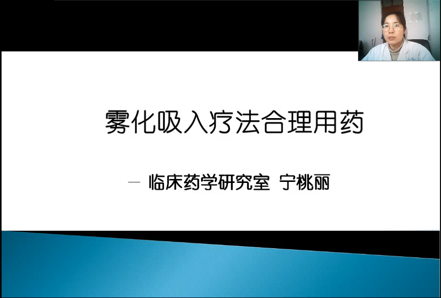1月26日下午4点,合理用药知识培训——“临床药师和您一起探讨合理用药”第十六期钉钉线上开播。本期讲座由临床药学研究室临床药师宁桃丽与大家分享《雾化吸入疗法合理用药》。