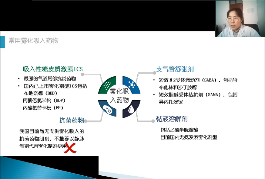 宁桃丽药师首先介绍了雾化吸入疗法的定义、适应症、优势及常用装置,随后又从作用机制、药理特性、用法用量、联合方案、配伍相容性等方面对常用雾化吸入药物进行了深入讲解。最后宁桃丽药师阐述了雾化吸入治疗的药学监护和用药教育,建议临床医师根据临床病例特征选择合适的药物品种及给药方案,加强药物安全性的监测,注意规范雾化吸入操作,避免非雾化吸入剂型的不合理使用。