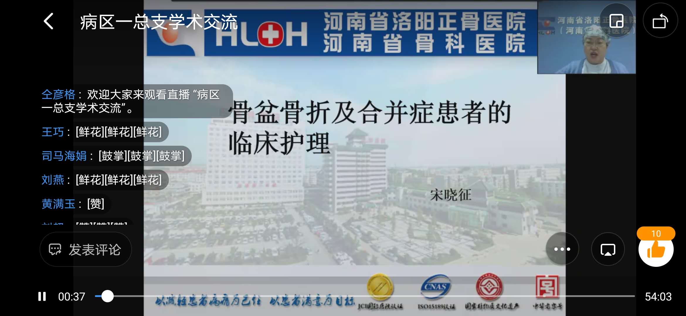 本次学术交流会在去年基础上进行了更新,新增了护理方面的内容,交流会的主题为《骨盆骨折及合并症患者的临床护理》,由骨盆髋臼科整形外科护士长宋晓征主讲。宋晓征护士长从骨盆解剖、骨盆骨折概述、常见合并症入手结合临床疑难案例,将骨盆骨折中遇到的护理难点、病情观察要点、常见合并症预防及处理、个性化的功能锻炼等进行了深入浅出的阐述,宋晓征护士长将多年积累临床经验和盘托出,为大家分享了一场护理学术饕餮盛宴,使临床护理人员受益匪浅。