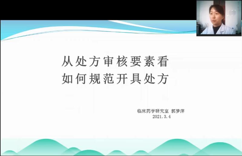 3月4日下午4点,合理用药知识培训——“临床药师和您一起探讨合理用药”第十七期钉钉线上开播。本期讲座由临床药学研究室主管药师郭梦萍与大家分享《从处方审核要素看如何规范开具处方》。
