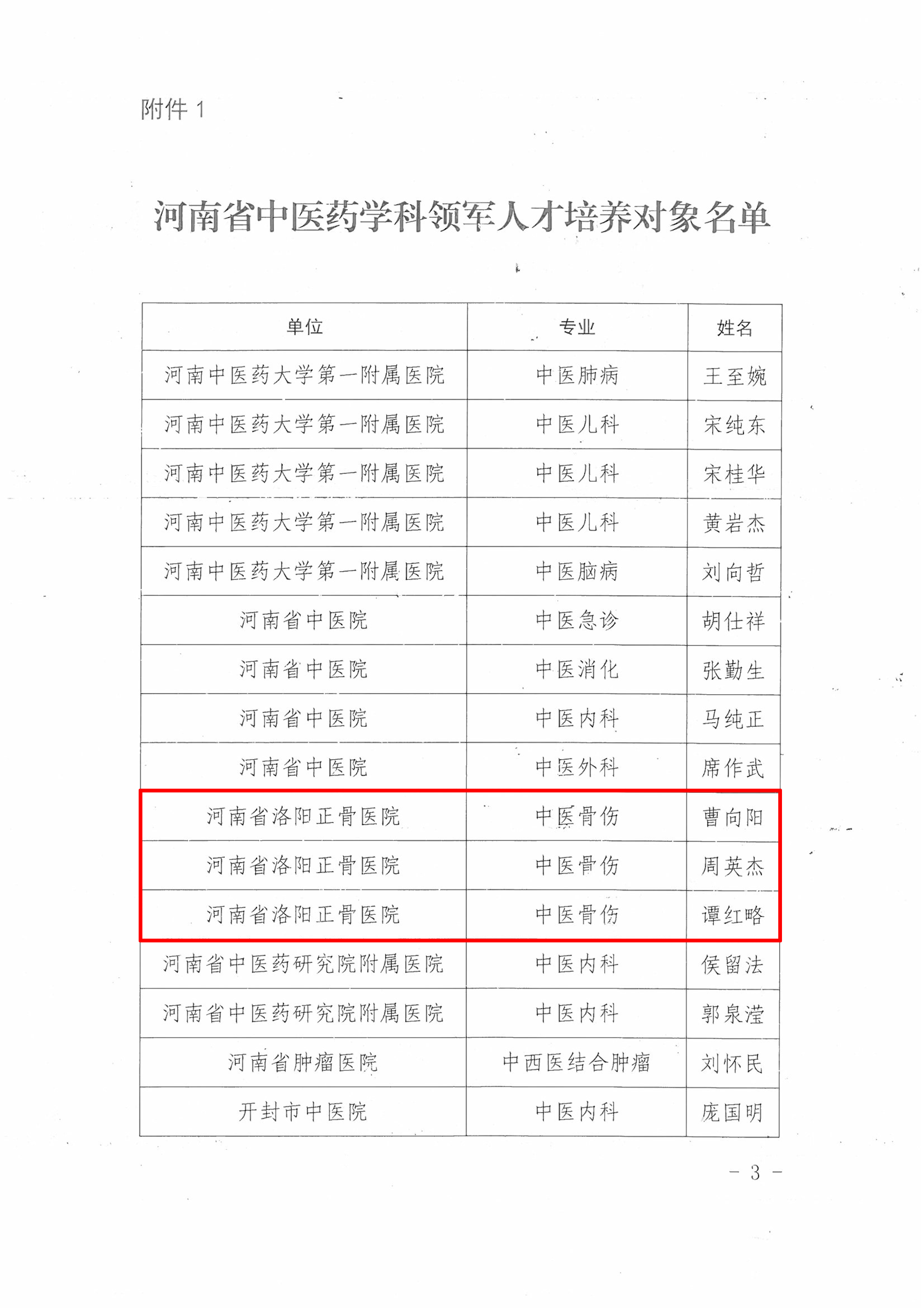 根据《河南省卫生健康委关于开展河南省中医药传承与创新人才工程(仲景人才工程)培养对象遴选工作的通知》(豫卫中医函〔2020〕61号)和《河南省卫生健康委关于公布中医药传承与创新人才工程(仲景工程)中医药学科领军人才第二批培养对象名单的通知》(豫卫中医函〔2021〕8号)文件,经个人申请、资格审查、医院推荐、省卫生健康委审核及公示程序,最终我院曹向阳、周英杰、谭红略三位专家被遴选为“第二批河南省中医药学科领军人才培养对象”。