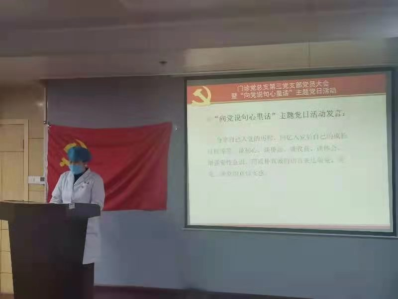 门诊医保党小组组长赵建秋同志发言,今年是中国共产党诞辰100周年。100年很漫长,但在历史的长河中却很短暂。可是,在这短短的100年里,在共产党的正确领导下一路披荆斩棘,中国创造了举世瞩目的成绩。身为一名共产党员,我倍感自豪,同时也不断警醒自己,要时刻牢记自己的责任与义务,不忘初心,继续努力,为实现共产主义奉献自己的力量。