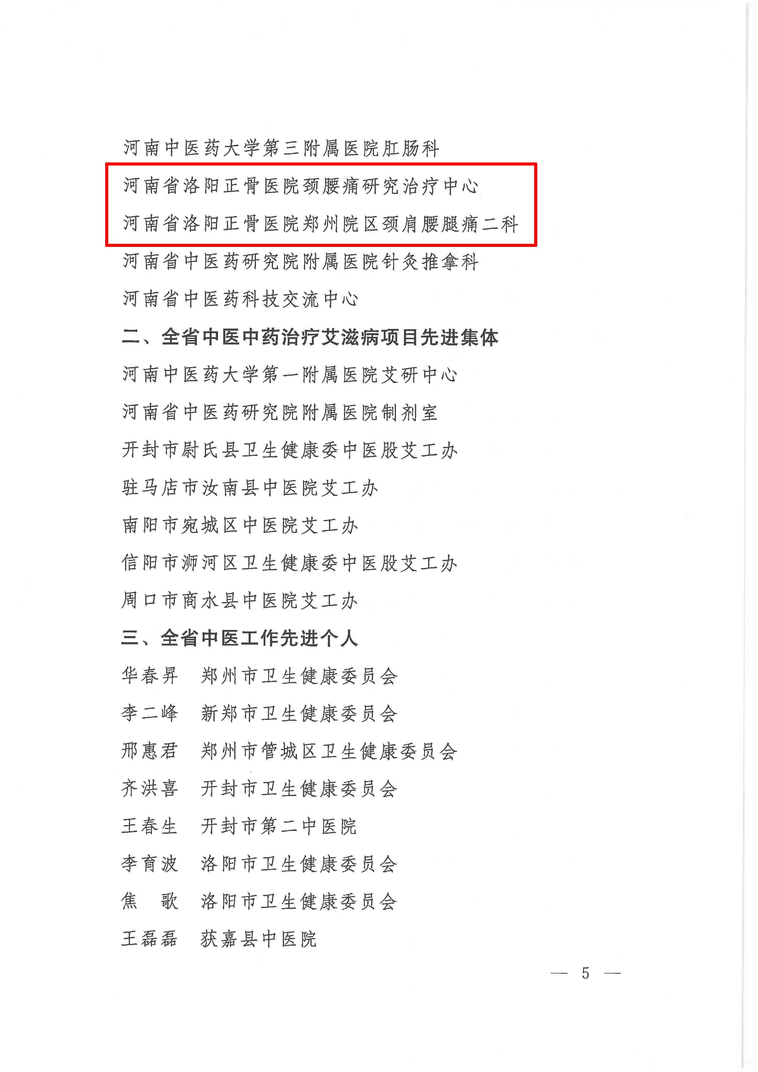 其中,我院颈腰痛研究治疗中心与郑州院区颈肩腰腿痛二科被评为全省中医工作先进集体;孙永强教授被评为全省中医工作先进个人;许建波主任被评为全省中医医院管理先进个人;张颖博士、李记天博士被评为全省中医科研工作先进个人;张韶国主任被评为全省中医药文化宣传工作先进个人。