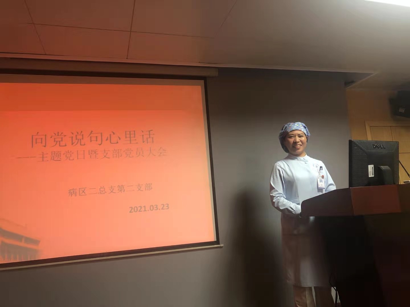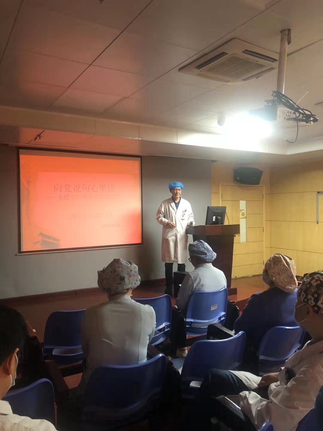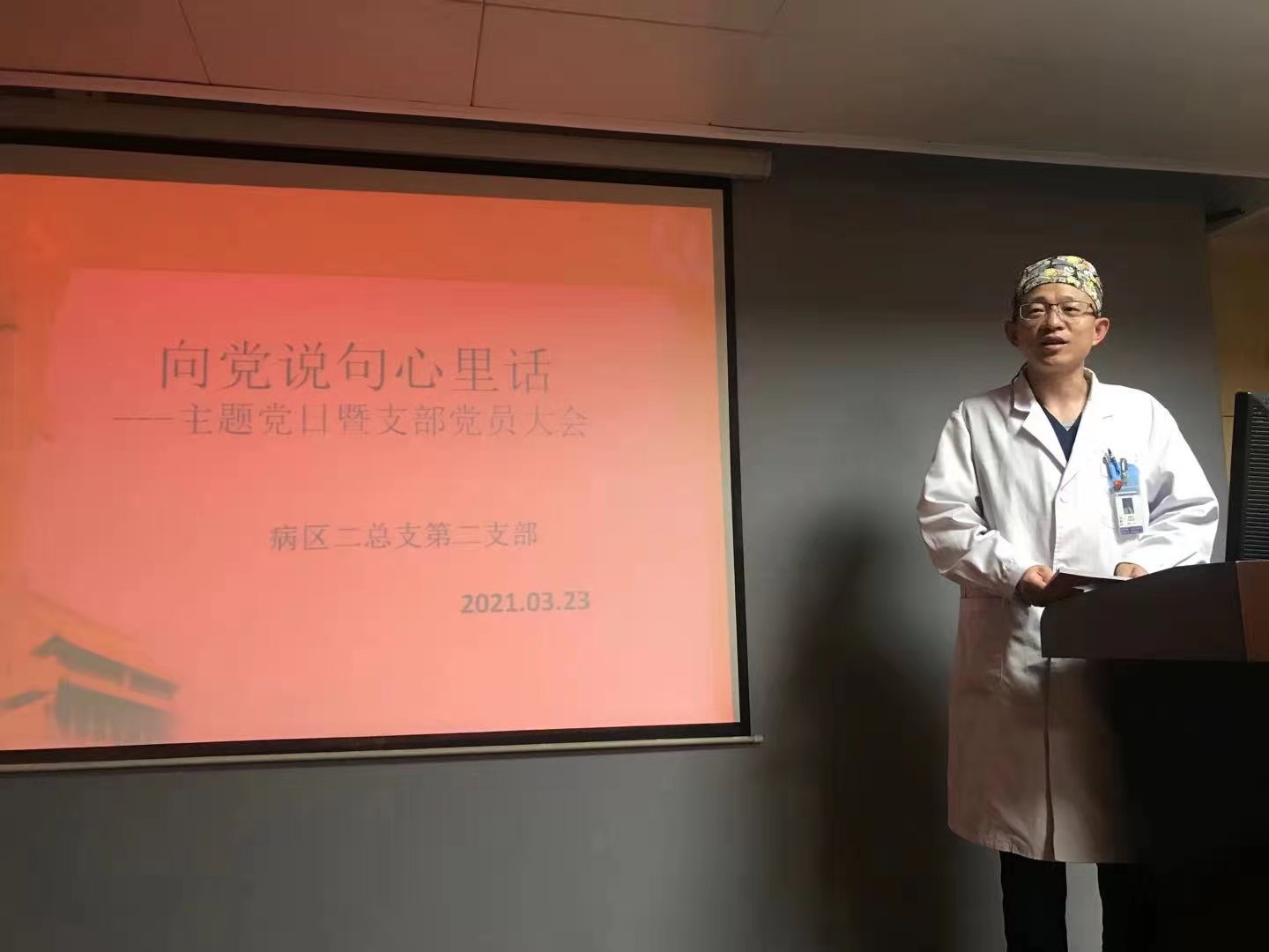 支部书记韩松辉说,今年是中国共产党成立100周年,是“十四五”规划开局之年,也是全面建设社会主义现代化国家新征程开启之年,按照医院2021年党建工作安排,开展“向党说句心里话”主题党日活动,忆初心,话担当,铭党恩,诉党情。紧密结合党中央关于在全党开展党史学习教育的部署要求,学党史、悟思想、办实事、开新局。作为医务工作者我们要以人民为中心,铭记历史,坚定信念,立足岗位,求真务实,努力工作,多做贡献。