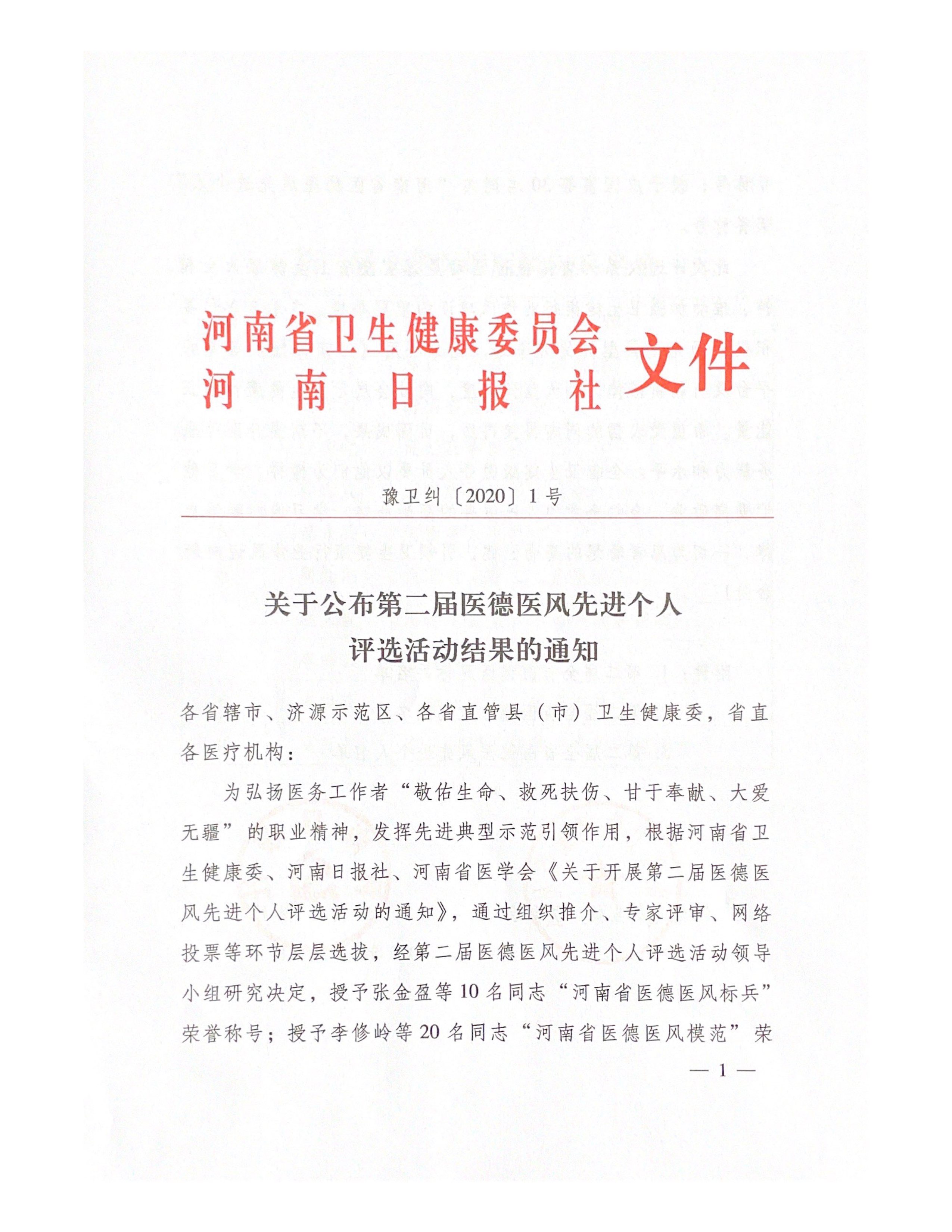 为弘扬医务工作者“敬佑生命、救死扶伤、甘于奉献、大爱无疆”的职业精神,发挥先进典型示范引领作用,根据河南省卫生健康委、河南日报社、河南省医学会《关于开展第二届医德医风先进个人评选活动的通知》,通过组织推介、专家评审、网络投票等环节层层选拔,经第二届医德医风先进个人评选活动领导小组研究决定,授予十名同志“河南省医德医风标兵”荣誉称号,我院郭珈宜同志光荣入选。