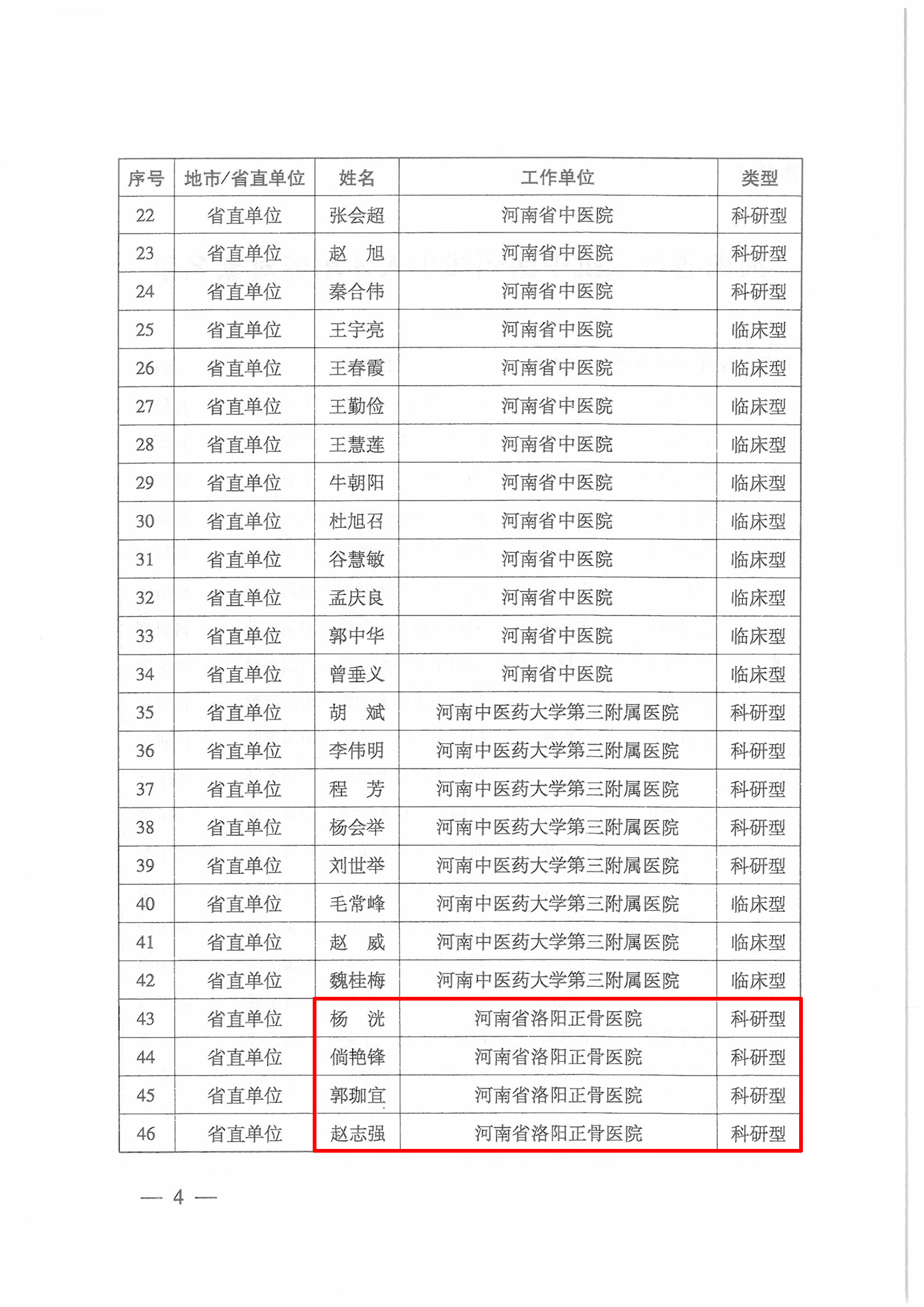 根据《河南省卫生健康委关于开展河南省中医药传承与创新人才工程(仲景人才工程)培养对象遴选工作的通知》(豫卫中医函〔2020〕61号)和《河南省卫生健康委关于公布中医药传承与创新人才工程(仲景工程)中医药拔尖人才第二批培养对象名单的通知》(豫卫中医函〔2021〕15号)文件,经个人申请、资格审查、医院推荐、省卫生健康委审核及公示程序,最终我院杨洸、倘艳锋、郭珈宜、赵志强四位专家被遴选为“第二批河南省中医药拔尖人才培养对象”。