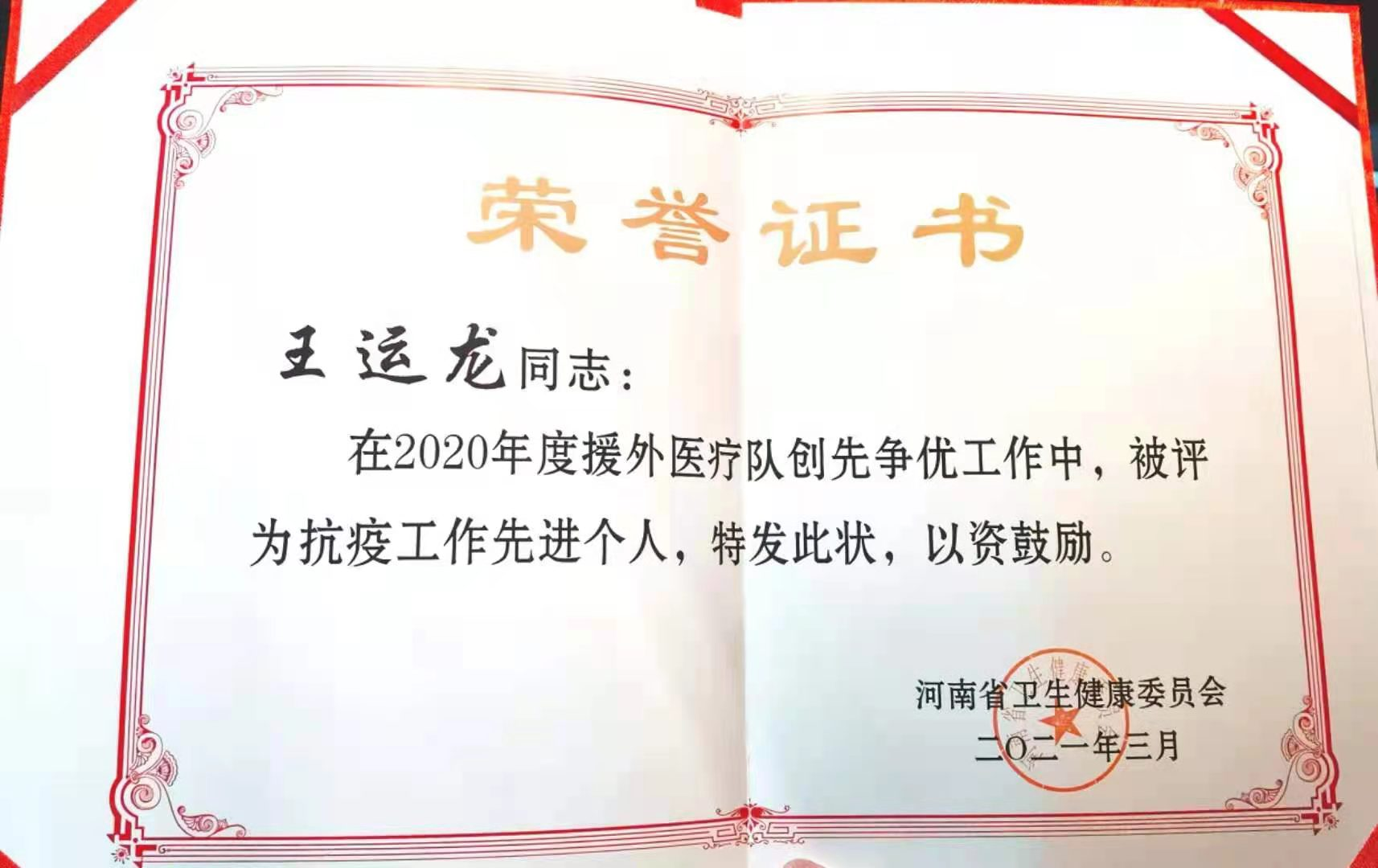 在2021年4月14日举办的2021年河南省归国援外医疗队总结座谈会上,我院复院区脊髓损伤康复科、脊髓损伤康复研究室主任王运龙同志在2020年度援外医疗队创先争优工作中,被评为抗疫工作先进个人。