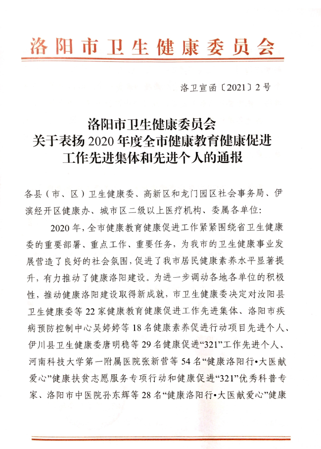 2020年,全市健康教育健康促进工作紧紧围绕省卫生健康委的重要部署、重点工作、重要任务,为我市的卫生健康事业发展营造了良好的社会氛围,促进了我市居民健康素养水平显著提升,有力推动了健康洛阳建设。为了进一步调动各地各单位的积极性,推动健康洛阳建设取得新成就,市卫生健康委决定对健康教育健康促进工作先进集体、健康素养促进行动项目先进个人、健康促进“321”工作先进个人、“健康洛阳行?大医献爱心”健康扶贫志愿服务专项行动和健康促进“321”优秀科普专家、“健康洛阳行?大医献爱心”健康扶贫志愿服务专项行动和健康促进“321”优秀志愿者、全市居民健康素养监测工作先进个人予以通报表扬。