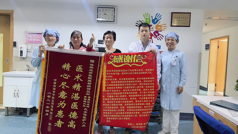 近日,我院膝部损伤三科收到了两位患者送来饱含真挚感谢的锦旗与感谢信,向科主任黄霄汉、护士长程月起、管床医生李继超和管床护士武文娟及膝部损伤三科全体医护人员送来了一面写有“医术精湛医德高,精心尽意为患者”的锦旗,表达了对膝部损伤三科医疗护理服务的高度认可与鼓励,高度赞扬了我院精湛的医疗技术,以及细致入微的医疗护理服务。