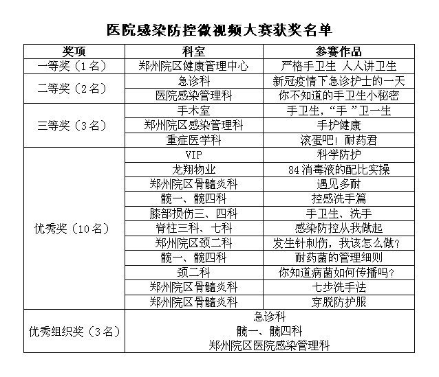 微视频大赛激发了医务人员主动参与感染防控热情,增加了感染防控培训的趣味性,提升了医务人员感染防控能力。大赛优秀作品将选送参加“中华预防医学会第30次全国医院感染学术年会第二届感染防控微视频大赛”。