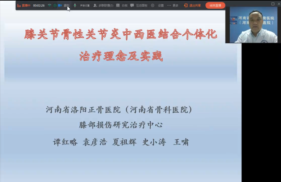 2021年4月28日下午四点,正骨讲堂第122期钉钉线上直播开讲。本期讲堂特邀请我院膝部疾病研究治疗中心副主任、膝部损伤四科主任谭红略为大家分享《膝关节骨性关节炎中西医结合个体化治疗理念及实践》。