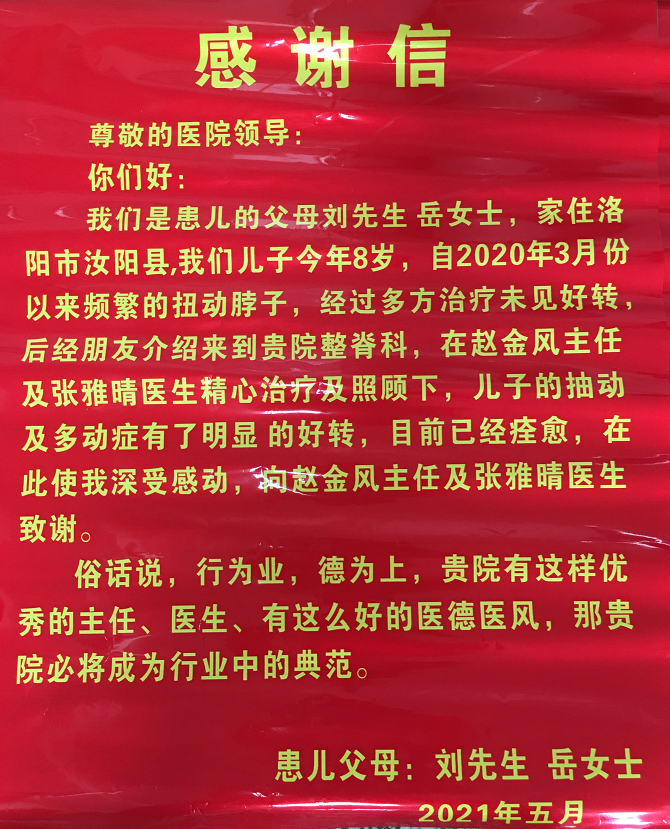 赵金风主任为患儿检查后,诊断为“儿童颈椎功能不良、儿童抽动秽语综合症”,根据患儿的病情制定了详细的治疗方案,通过中医传统整脊手法、针灸、感觉综合等治疗,经过4次治疗后,症状明显好转,目前患儿已经基本痊愈。为表达感谢,刘先生和岳女士专门来到我院门诊综合治疗二区、整脊科送上一面锦旗和感谢信表示感谢。