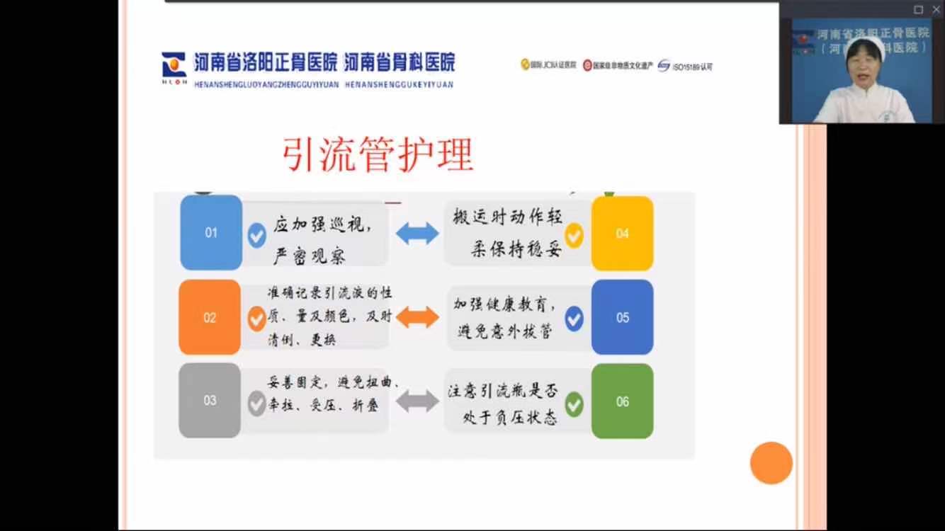 骨髓炎作为我院的优势、特色病种,其治疗效果受到患者及同行的一致好评,这不仅得益于我院在骨髓炎治疗方面科学、规范、独特的治疗方法,也与其专业的护理密不可分。绳景亚护士长结合骨髓炎患者行骨搬移术围手术期护理的典型病例,从病人基本情况、病人的诊疗过程、病人的护理及康复和耐药菌患者的管理等方面进行讲解,深入浅出,内容科学规范、详实全面。