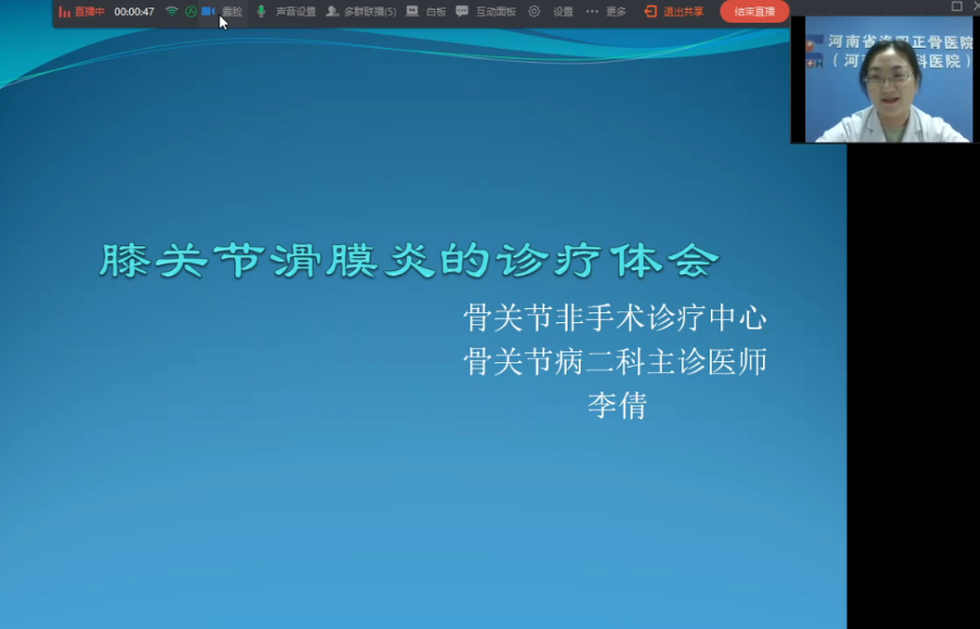 2021年6月30日下午四点,正骨讲堂第128期钉钉线上直播开讲。本期讲堂特邀请我院骨关节病二科主诊组长李倩为大家分享《膝关节滑膜炎的诊疗体会》。