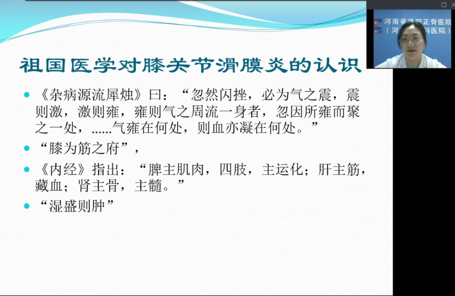 李倩表示,中医里,膝关节滑膜炎属于痹证范畴。有关节痹痛、顽痹、历节、筋骨痹等称谓。膝关节滑膜炎是我们中医骨伤科辨证施治的优势病种。李倩为大家分享了膝关节滑膜炎的中医分型与治疗原则,并详细讲解了急性期及缓解期的主要治疗方案。李倩指出,中医骨伤在治疗膝关节滑膜炎方面有显著优势。中药汤剂辩证应用适合于滑膜炎的各个时期。并表示,教育训练,饮食调护、生活起居、功能锻炼在预防膝关节滑膜炎复发中起重要作用。