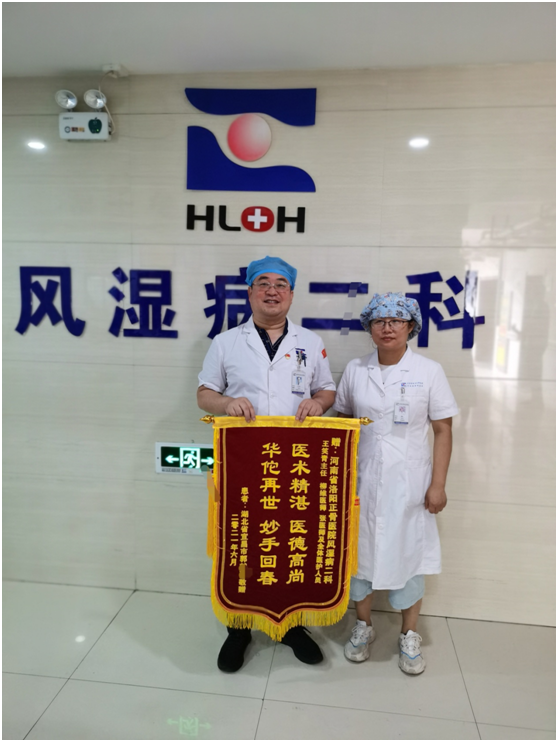 2021年6月28日,风湿病二科的王笑青主任收到一件来自湖北宜昌市的邮件,带着疑惑,王主任打开了邮件,是一面书写着“医术精湛,医德高尚;华佗在世,妙手回春”的锦旗。看到落款,王主任终于明白了。