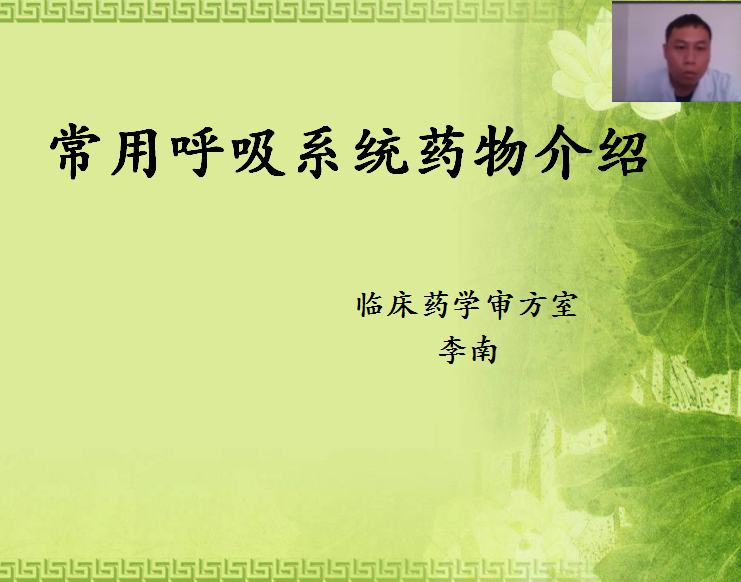 8月26日下午4点,合理用药知识培训——“临床药师和您一起探讨合理用药”第二十二期钉钉线上开播。本期讲座由临床药学研究室主管药师李南与大家分享《常用呼吸系统药物介绍》。