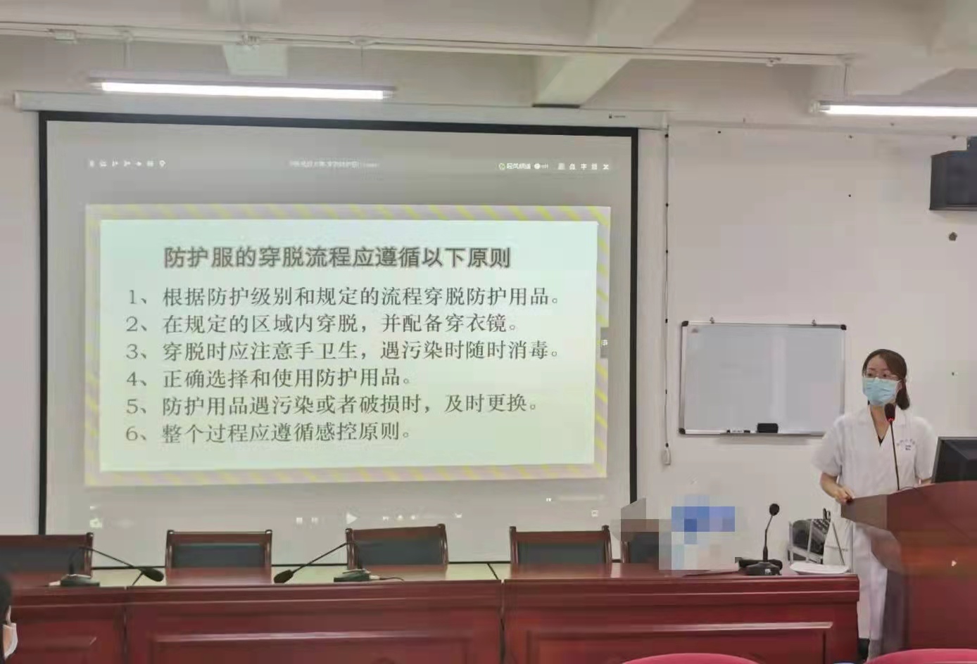 培训由医院感染管理科副主任周水红主持。医院感染管理科张亚伟采用播放视频和现场演练的形式,现场教授大家防护用品的使用方法。从防护用品使用原则、物品准备、手卫生正确方法、防护服穿脱流程等方面进行细致的讲解,并针对穿脱过程中每个步骤的注意事项,进行现场演示。之后,参与培训人员分组进行练习,并相互指出穿脱过程中存在的感染风险,张亚伟老师一一进行指正,使培训人员牢固掌握防护用品的使用方法和流程。