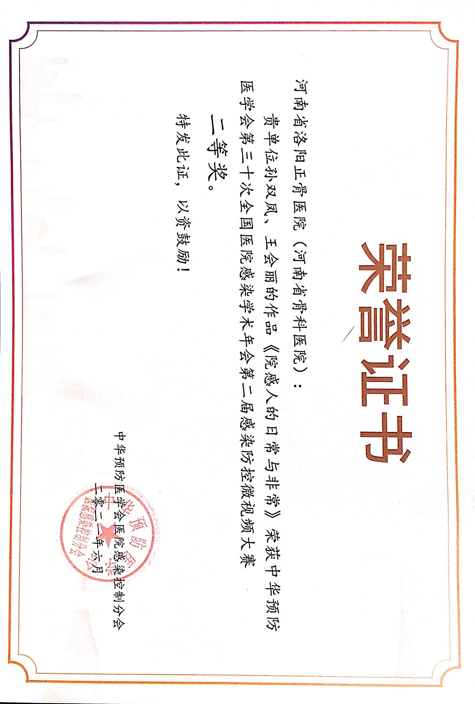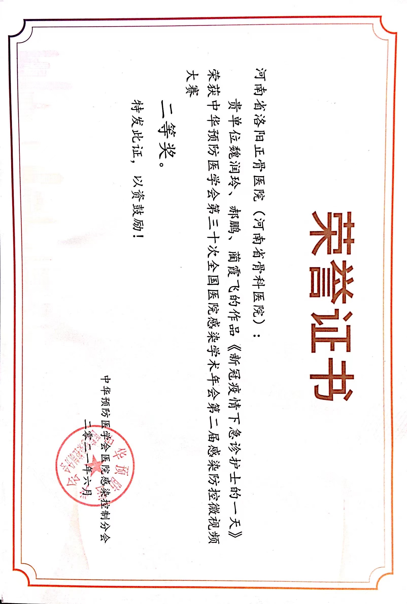 2021年6月,在江城武汉举办的中华预防医学会第30次全国医院感染学术年会上,来自我院的《新冠疫情下急诊护士的一天》、《滚蛋吧,耐药菌》、《院感人的日常与非常》三个作品,经过大会初筛、随机抽选评委、现场评选等环节层层选拔,最终均荣获“第二届感染防控微视频大赛”二等奖。